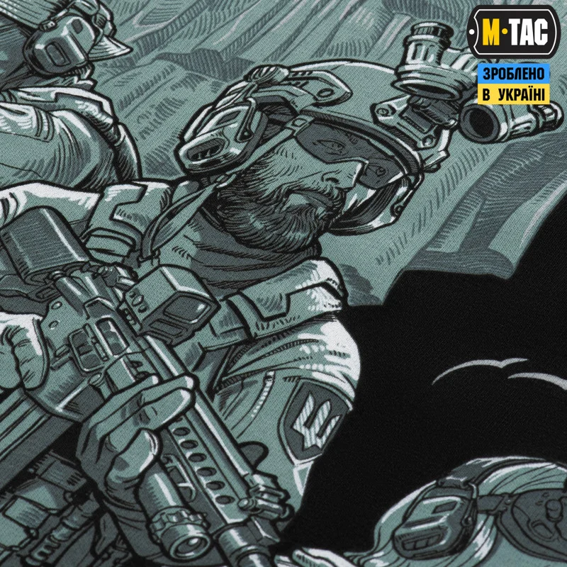 На принті зображені наші військові. Ті, хто з перших днів війни розносить “другу армію світу”. Своїми діями вони змінюють світ. Кожен з них - герой. Позаду військових стоїть Батьківщина - мати, символ незламності українського народу. ЇЇ щит - захищає від ворожих куль, а меч - дає гідну відсіч ворогу. Вона спокійна та непохитна, вона така ж, як кожен український захисник та захисниця. Незважаючи на стать, вік чи професію, їх об’єднує одна велика ціль - перемога.