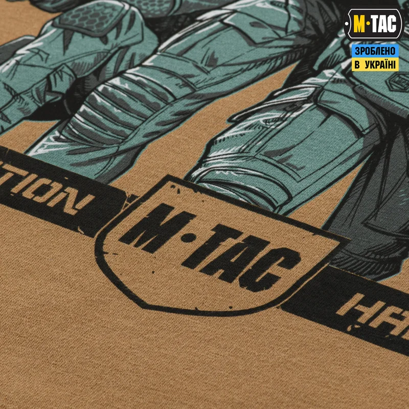 На принті зображені наші військові. Ті, хто з перших днів війни розносить “другу армію світу”. Своїми діями вони змінюють світ. Кожен з них - герой. Позаду військових стоїть Батьківщина - мати, символ незламності українського народу. ЇЇ щит - захищає від ворожих куль, а меч - дає гідну відсіч ворогу. Вона спокійна та непохитна, вона така ж, як кожен український захисник та захисниця. Незважаючи на стать, вік чи професію, їх об’єднує одна велика ціль - перемога.