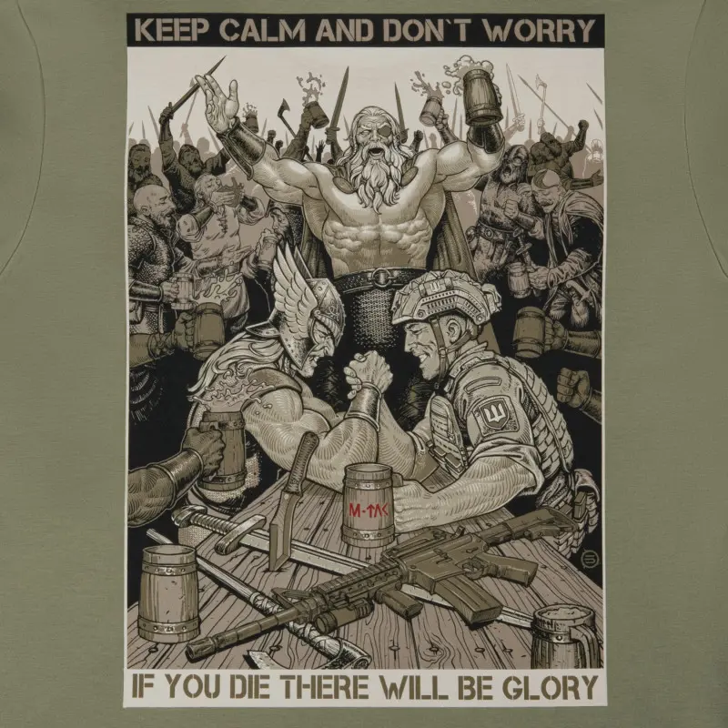 На принті футболки зображено сюжет, на якому український захисник потрапляє в Валгаллу. Там з одним із стародавніх воїнів, він зійшовся в дуелі з армреслінгу, а час до початку поєдинку для них відраховує сам Одін. Написи на принті “KEEP CALM AND DONT WORRY” та “IF YOU DIE THERE WILL BE GLORY” символізують славу для кожного захисника рідної землі, навіть після смерті.