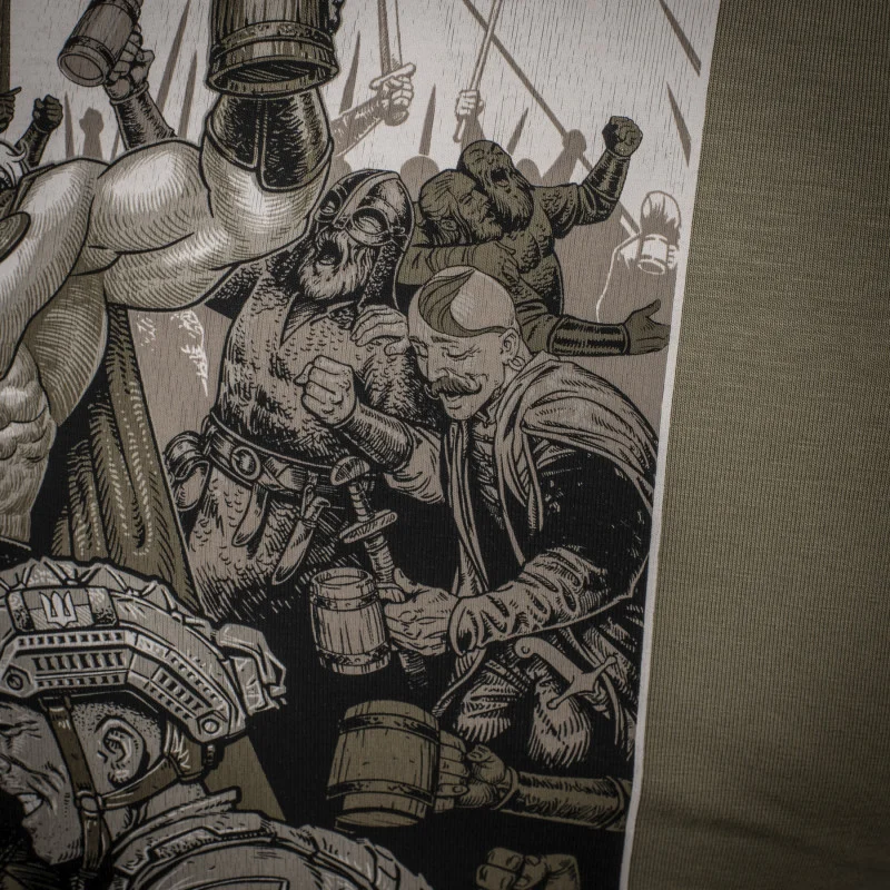 На принті футболки зображено сюжет, на якому український захисник потрапляє в Валгаллу. Там з одним із стародавніх воїнів, він зійшовся в дуелі з армреслінгу, а час до початку поєдинку для них відраховує сам Одін. Написи на принті “KEEP CALM AND DONT WORRY” та “IF YOU DIE THERE WILL BE GLORY” символізують славу для кожного захисника рідної землі, навіть після смерті.