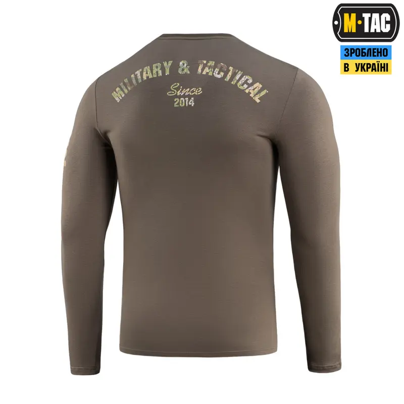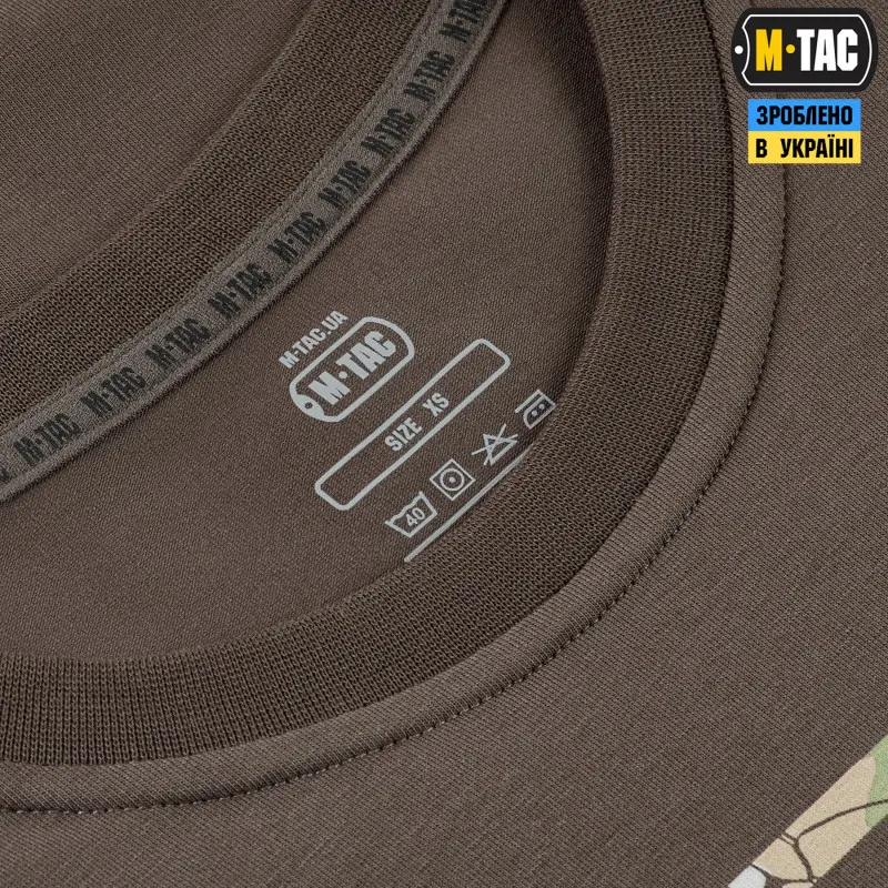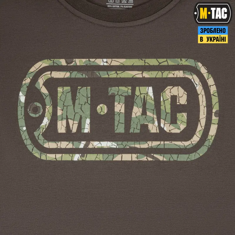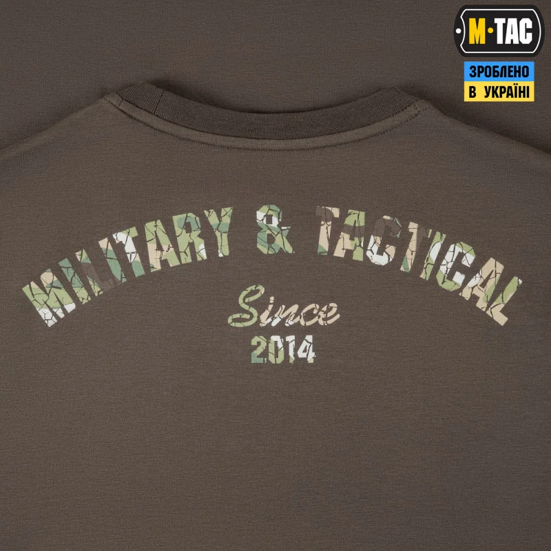 На спині футболки також стилізований камуфляжний напис Military&Tactical Since 2014. Саме під час Революції Гідності народилась ідея створення українського бренду з пошиття та виготовлення тактичного одягу для військових і спецпризначенців. З того часу бренд активно розвивається, а одяг та спорядження від М-Тас вже неодноразово пройшли перевірку найгарячішими військовими конфліктами сьогодення.