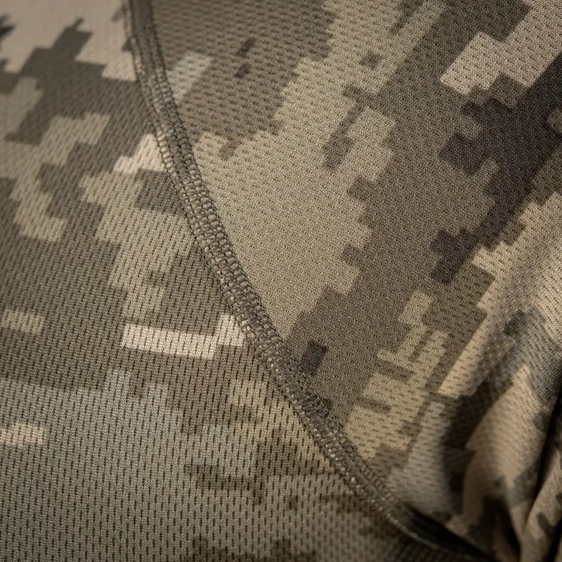 Футболка пошита з високотехнологічного матеріалу, що має високі потовідвідні властивості, швидко сохне та забезпечує оптимальну терморегуляцію. Еластична тканина облягає тіло, зберігаючи при цьому повну свободу дій. На рукавах футболки дизайнери передбачили велкро панелі для розміщення знаків розрізнення та ідентифікаторів. Анатомічний крій вдало підкреслює фігуру та не сковує рухів під час фізичних навантажень.