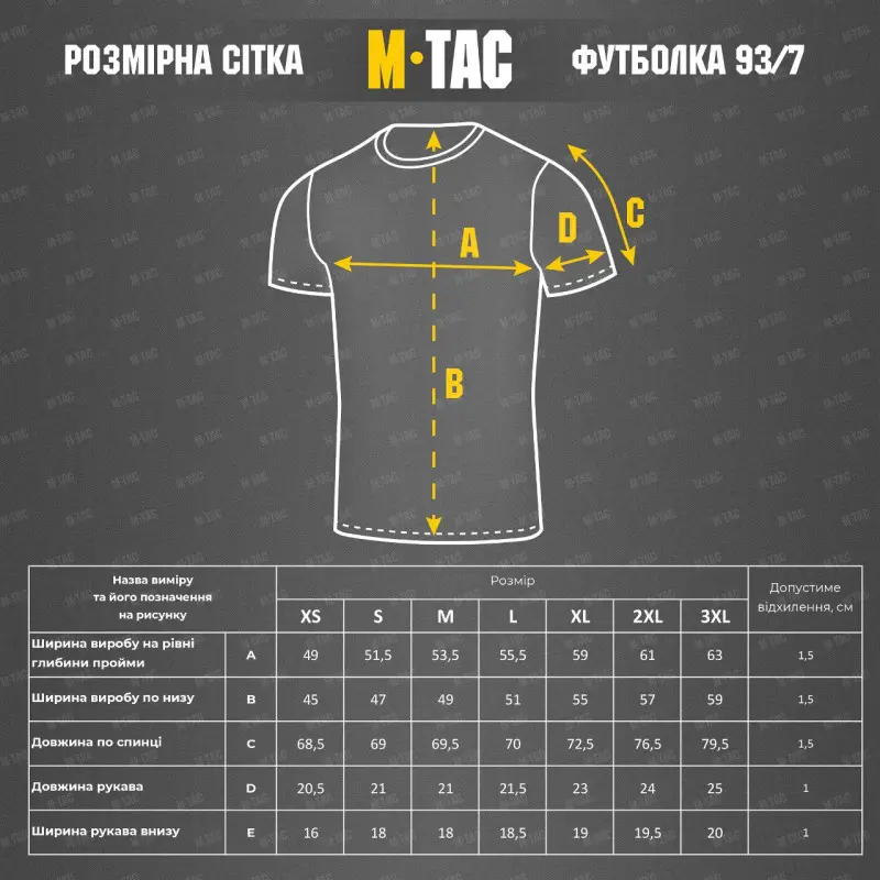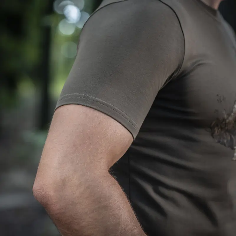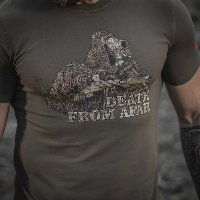 Бренд M-Tac представляє футболку Sniper. Футболка присвячена снайперам, на принті зображено снайперську пару з написом «Death From Afar» (Смерть здалеку). M-Tac футболка виготовлена на 93% з бавовни, решта ж 7% це "еластан". Завдяки цьому футболка витримує не один десяток циклів прання і не втрачає при цьому форми. Футболка - це обовязкова частина гардероба будь-якого чоловіка. Область споживання і застосування наших футболок величезна - від повсякденного носіння до використання як уніформи для військових підрозділів і силових структур. Футболки максимально підходять для використання при активному способі життя - полювання, риболовля, заняття спортом, туризм. Тонкий еластичний і якісний трикотаж вдало підкреслює рельєф мускулатури і дає повне відчуття комфорту.