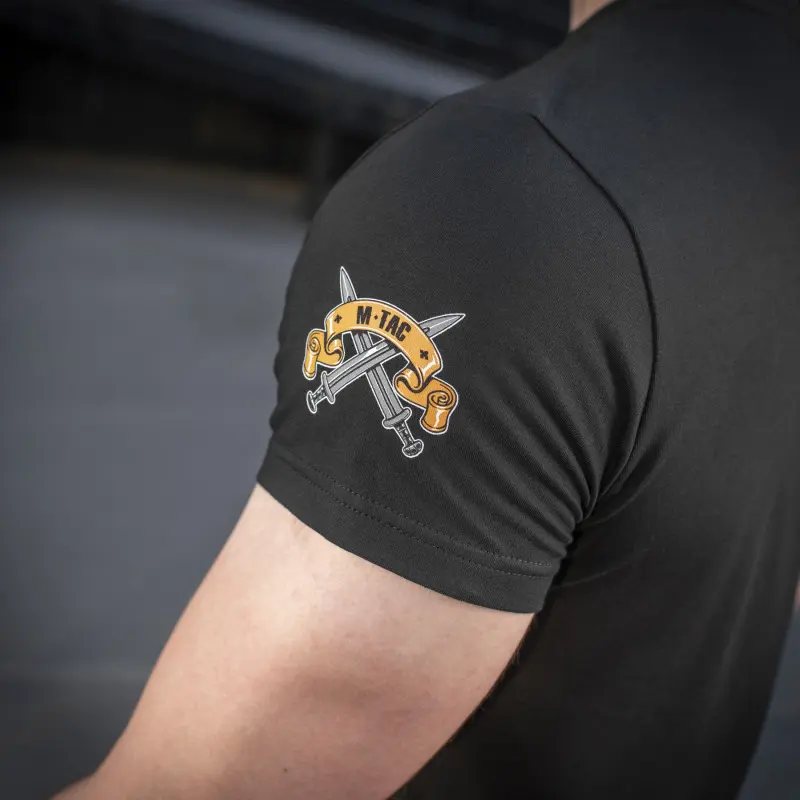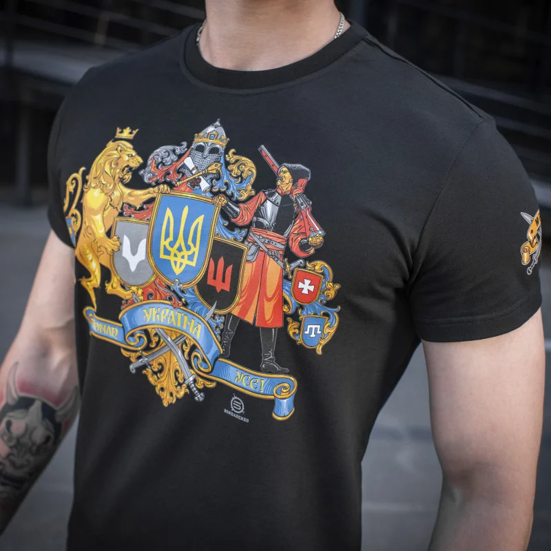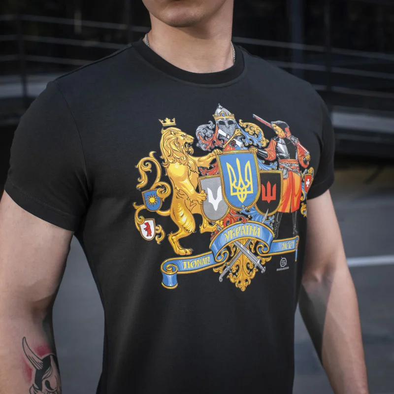 Оригінальна футболка «Україна понад усе» від M-Tac містить інтерпретацію на тему великого Державного Герба України від відомого художника-ілюстратора Олексія Бондаренка. Даний принт уособлює цілу низку історичних подій. Зокрема, у центрі зображення розміщені малий Державний Герб України, герб Святослава та тризуб УНР. По обидва боки від щитів зображено щитотримачів: золотий лев, який вважається символом Галицько-Волинського князівства, та козак з мушкетом, який уособлює Військо Запорізьке. Вони символізують обєднання сходу та заходу України. Увінчує принт шолом із короною – символ княжої влади в Київській Русі. Знизу розміщена стрічка в національних кольорах із написом «Україна понад усе», що ще більше підсилює смислове навантаження виробу.