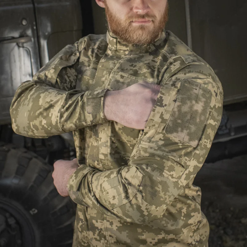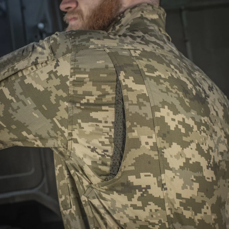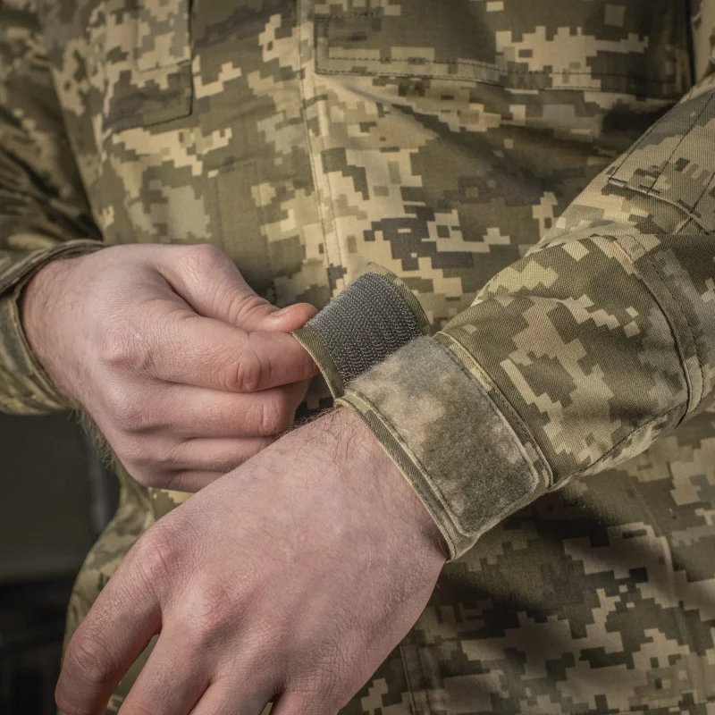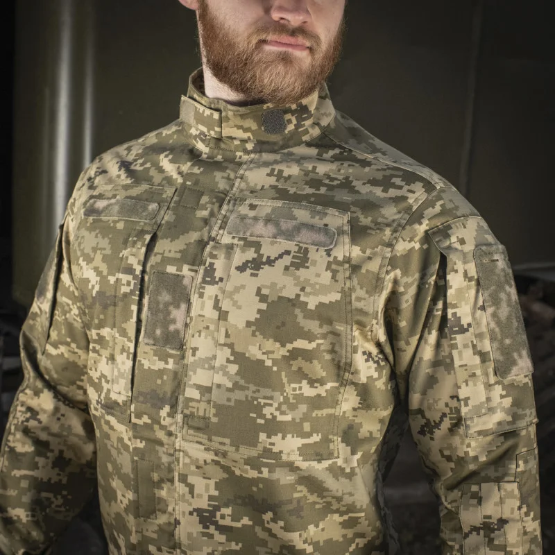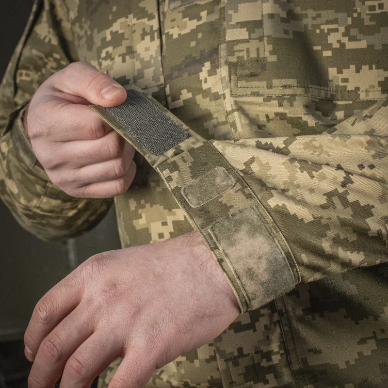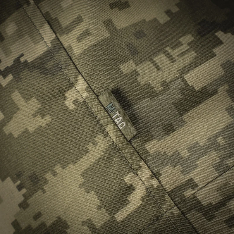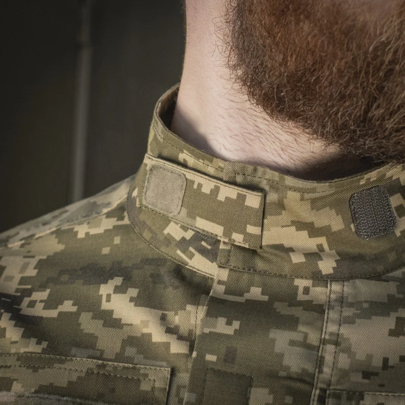 Кітель армійський літній в камуфляжному кольорі MM14 від бренду M-Tac поєднує в собі зручність, практичність, зносостійкість і комфорт. Пошитий з легкої тканини ріп-стоп: 50% бавовна, 50% поліестер. Оптимальне поєднання стійкості до зношування і повітропроникності. Саме такої якості тканина йде на пошиття уніформи для військових у Британії. Кітель має вільний крій і застібається на центральну блискавку, прикриту планкою на липучках. Комір-стійка регулюється за розміром за допомогою хлястика з велкро. Внутрішня вставка з сітки призначена для поліпшення вентиляції та відведення вологи.