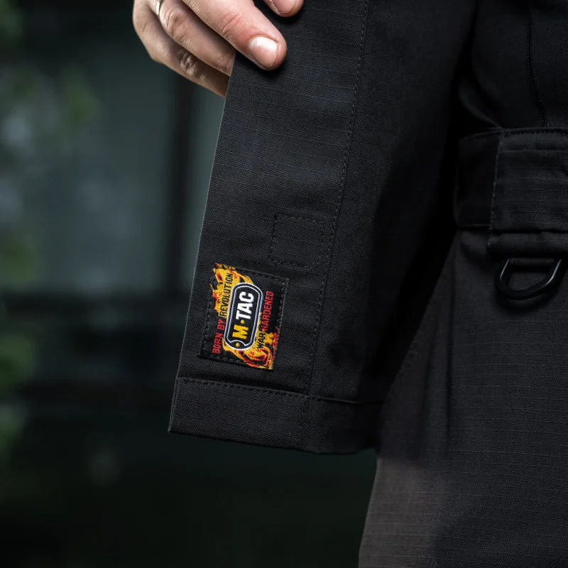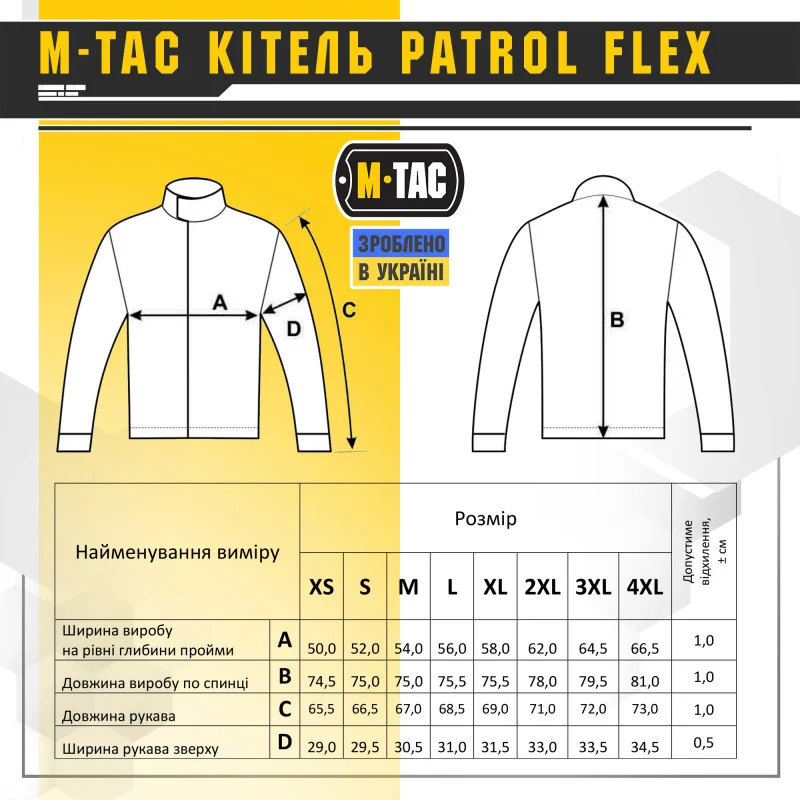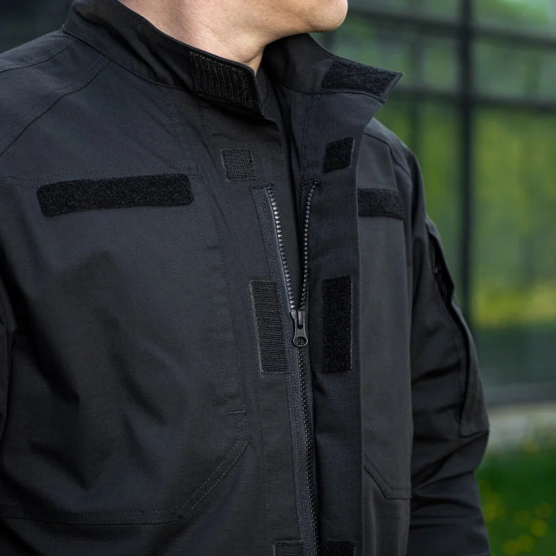 M-Tac кітель Patrol Flex має зручний, злегка приталений крій. Кітель має воріт-стійку, закривається на липучку Velcro, а також центральну застібку у вигляді рознімної «тракторної» пластикової блискавки і прикриває її планки на липучці.