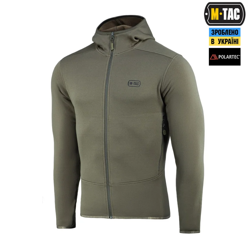 Кофта застібається на блискавку від YKK – світового лідера з виробництва фурнітури. Низькопрофільний капюшон щільно прилягає до голови і може виконувати функцію теплої шапки. Низ кофти, манжети та край капюшона обшиті еластичною брендованою резинкою, що добре прилягає до тіла та перешкоджає потраплянню холодного повітря всередину. Дві великі бокові кишені на блискавках оснащені сітчастою підкладкою, що забезпечує додаткову вентиляцію. Прямий крій не обмежує рухів і дозволяє почуватись комфортно навіть під час фізичних навантажень.