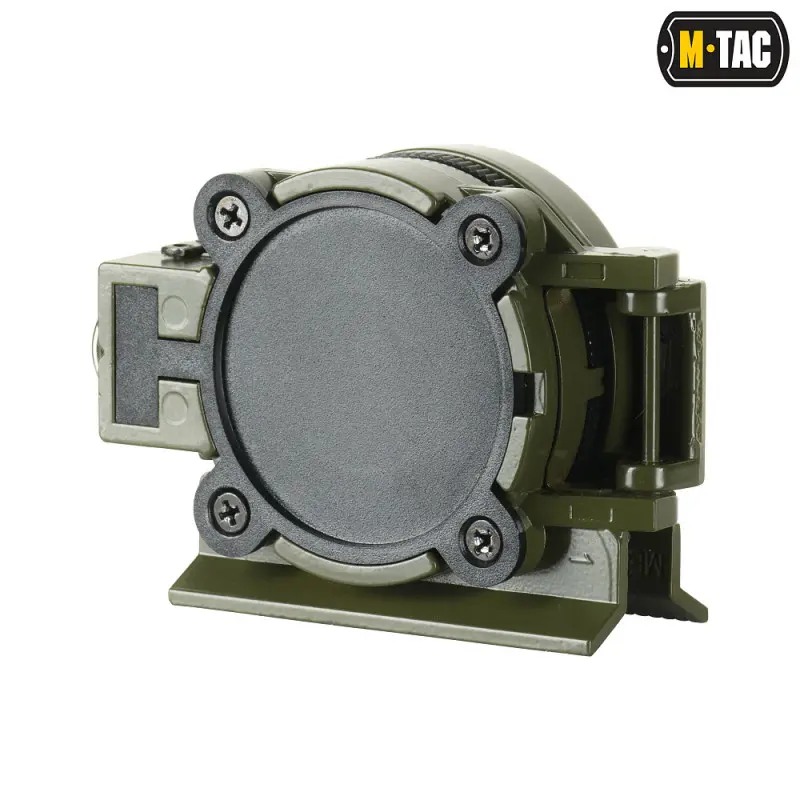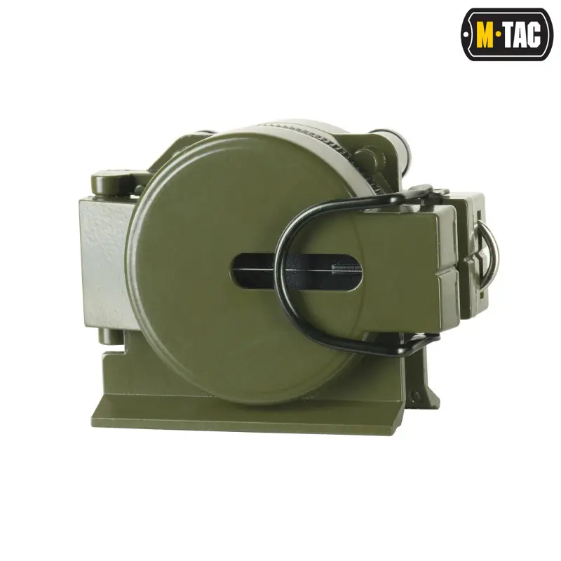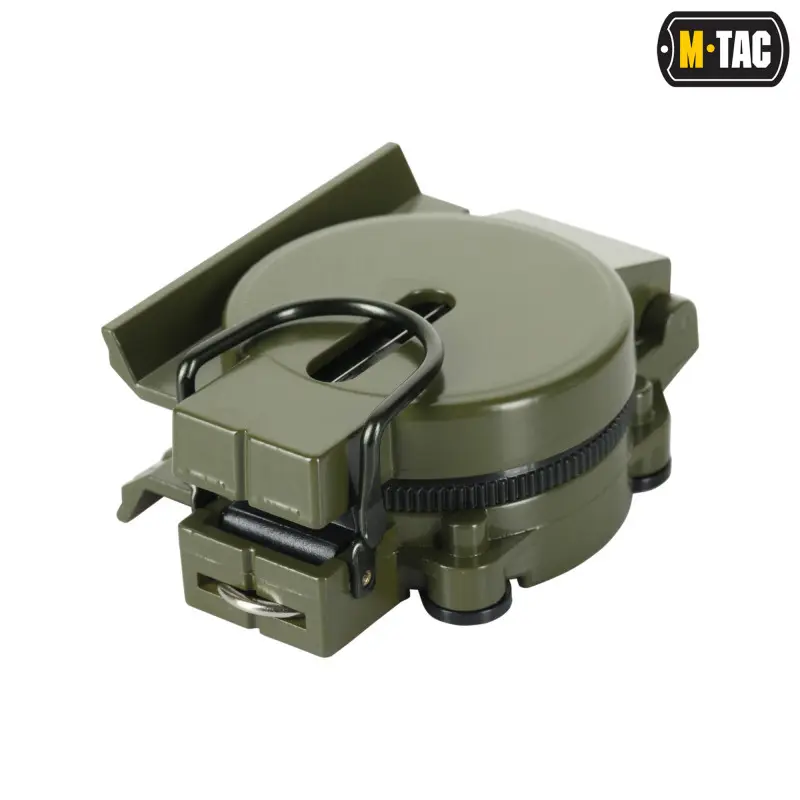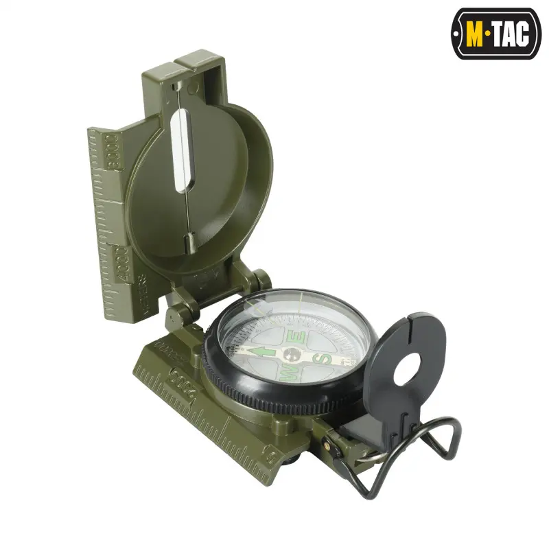 Компас M-Tac на складаній алюмінієвій рамці (кришка з візиром і підставка, на якій обертається капсула з лімбом і стрілкою.) Рамка використовується для установки азимута. Азимут береться так: направляємо довгу сторону компаса на орієнтир, повертаємо капсулу з лімбом так, щоб північ стрілки збіглась з північчю на лімбі. За зарубкою, на повернутому до орієнтира кінці рамки, зчитуємо чисельне значення азимута. Дана модель компаса оснащена глазком, щоб більш точно подивитись комбінацію азимута. Також точні розрахунки допомагає робити лінійка, нанесена на рамку компаса.