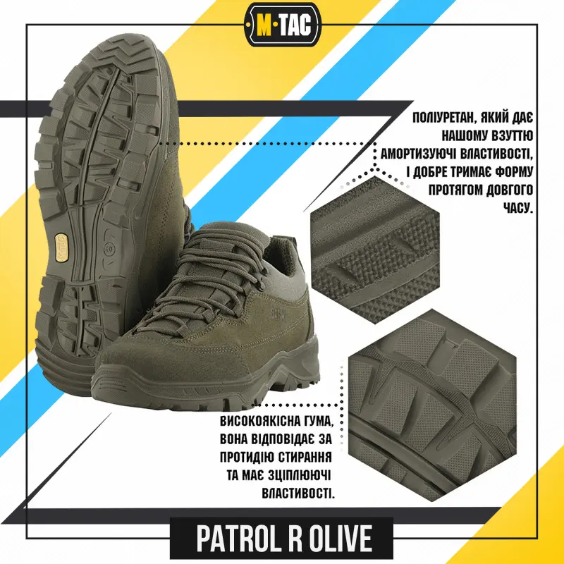M-Tac кросівки Patrol від бренду M-Tac поєднують в собі доступну ціну і гарна якість. Черевики виготовлені з якісної натуральної шкіри і синтетичних матеріалів. Носок черевика посилений додатковою накладкою зі шкіри з гумовим напиленням. Метод кріплення підошви - вакуумно-термічний. Це означає, що вона не прошивається разом з кріпленням до взуття, забезпечуючи тим самим додатковий захист від попадання вологи всередину. Верхній шар підошви поліуретановий і має властивості, що амортизують, полегшує ударні навантаження, а також надає підошві комфорт, легкість і підвищену термоізоляцію. Нижній шар підошви стійкий до стирання, тому що зроблений з гуми, і має високий коефіцієнт зчеплення, що істотно підвищить термін експлуатації.