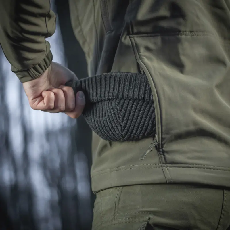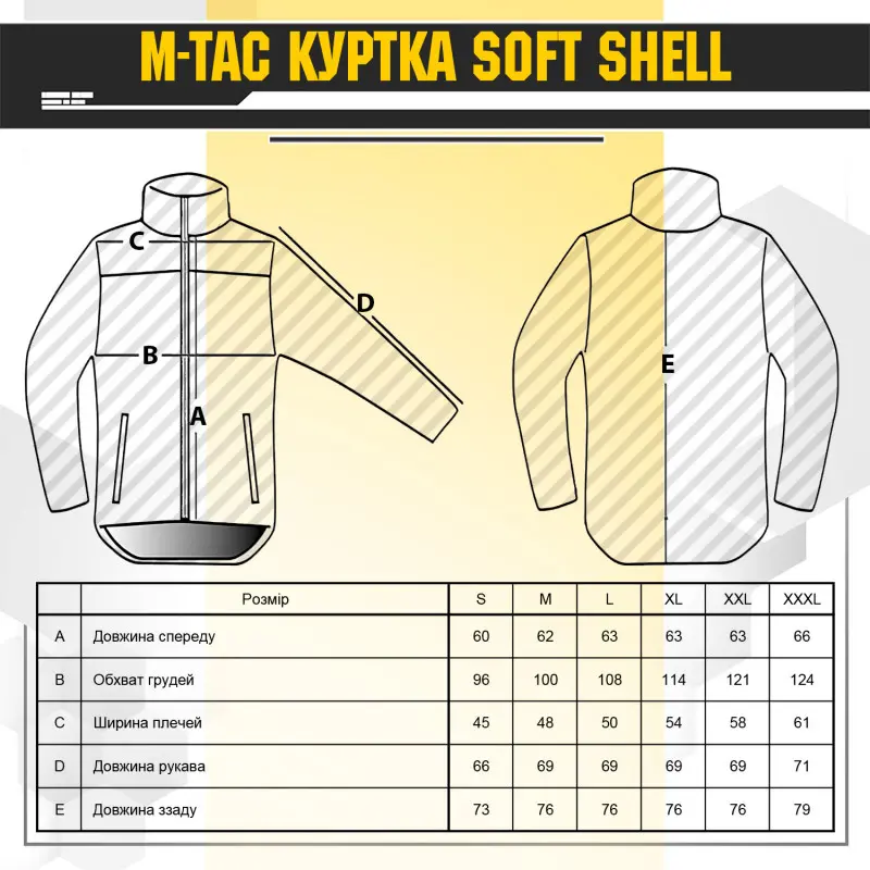 M-TAC куртка Soft Shell виготовлена з поміжслойної поліуретанової мембрани, яка захищає від негоди. Усередині тонкий фліс. Важливими властивостями виробів з софтшелла є їх невелика вага і комбінація двох шарів одягу в одному. Софтшелл обєднує в собі зовнішній шар (для захисту від вітру і негоди) і ізолюючий внутрішній шар. Поверхня не тільки захищає від вологи, але так само і відхиляє бруд. Крім того, мякий і обтічний матеріал надає більше комфорту при носінні. Передня блискавка виготовлена компанією YKK, вона якісна і виконує свою функцію без будь-яких видимих проблем.