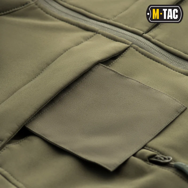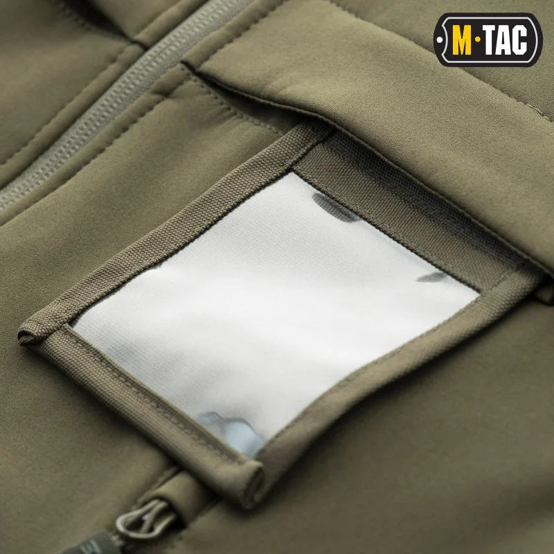 M-TAC куртка Soft Shell Police виготовлена з мембрани, яка захищає від негоди. Усередині тонкий фліс. Динамічний крій не обмежує рухів. Прихований в комірі капюшон має регулювання через кишені на грудях. Має дві ідентифікаційні панелі, які, в залежності від ситуації, можна дістати або заховати. У куртці є одна порожня панель, завдяки якій є можливість вишити або надрукувати потрібні оператору назви. Фахівці бренду M-Tac додали систему, яка дозволить зручно і швидко дістати зброю або інші предмети, котрі знаходяться на поясі. Дана система дозволить одним плавним рухом дістати зброю, електрошокер, або інші аксесуари, що помітно впливає на час реакції в небезпечних випадках. Передня блискавка виготовлена компанією YKK. Блискавка якісна і виконує свою функцію без будь-яких видимих проблем.