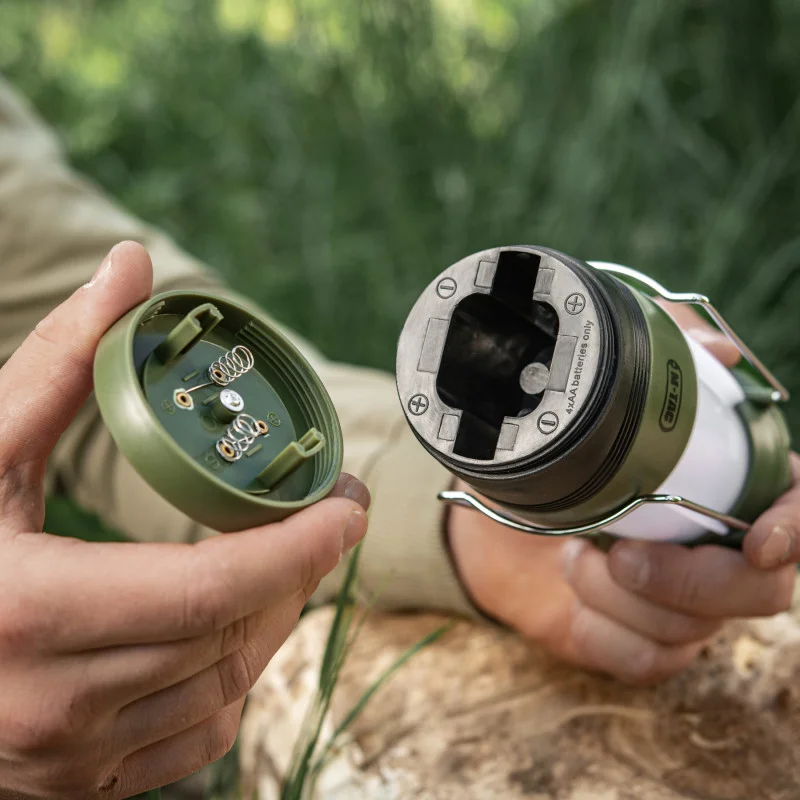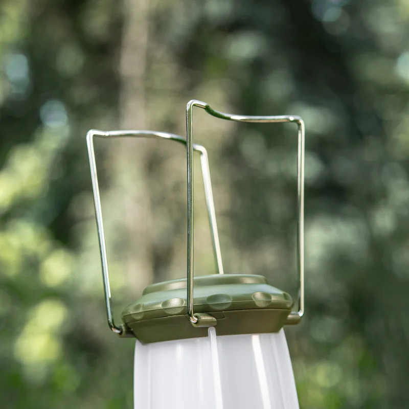 Ліхтар працює від 4-х батарейок (у комплект не входять). Зверху є дві металеві ручки, які дають можливість повісити ліхтарик і використовувати його як стаціонарне джерело освітлення.