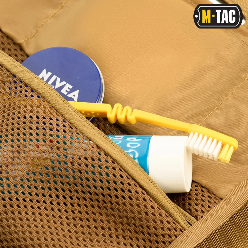При створенні сумки M-Tac для туалетного приладдя малися на меті кілька цілей. Дана сумка призначена для зберігання різних засобів гігієни та інших дрібниць. Дійсно, це зручний і практичний аксесуар, що дозволяє компактно зберігати бритву, зубну щітку, пасти, креми, шампуні і різні дрібниці. У складеному стані сумка компактна і не займає багато місця, але водночас вона може вмістити в собі все туалетне приладдя, яке може знадобитися солдату.
