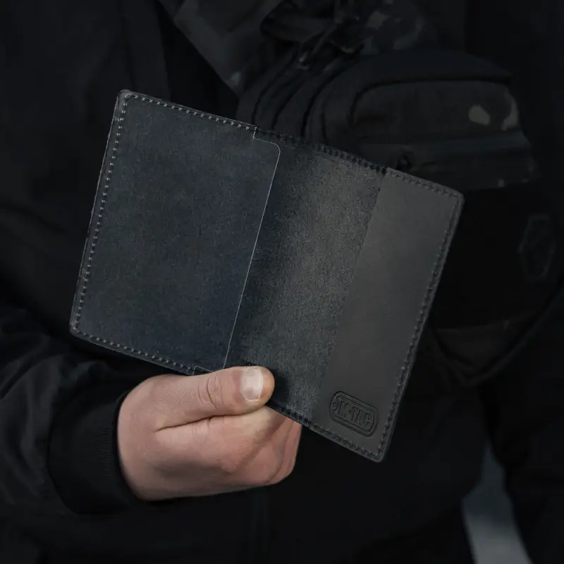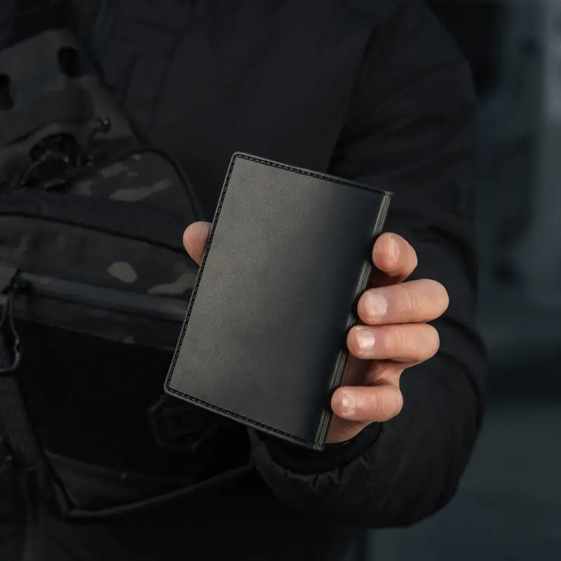 Обкладинка виготовлена з натуральної шкіри. Цей матеріал, часто використовується для виготовлення гаманців, обкладинок та картхолдерів, адже володіє винятковою стійкістю до стирання, міцністю та довговічністю. Метод нанесення малюнків та написів - тиснення.