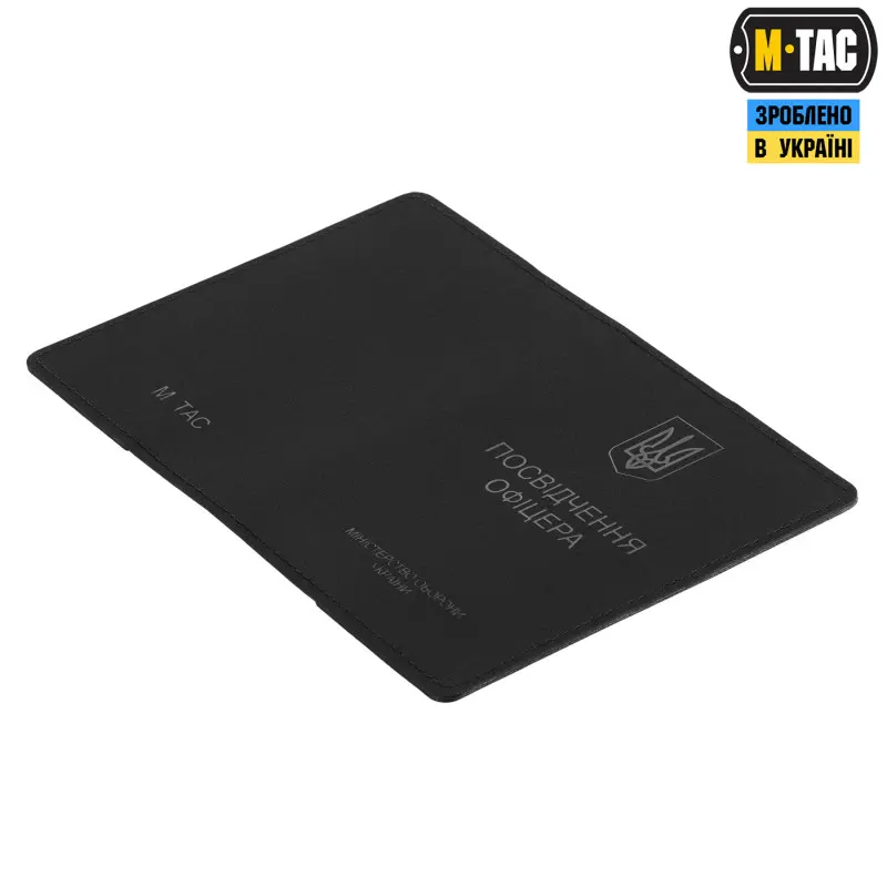 Пошита з сучасного полімерного композиту, який володіє винятковою стійкістю до стирання, міцністю та довговічністю. На лицьовій стороні обкладинки розміщені написи “Посвідчення офіцера” та “Міністерство оборони України”, а також розташоване зображення герба України. На звороті - логотип бренду М-Тас. Всередині передбачені прозорі відсіки для зручного розміщення Вашого документа.