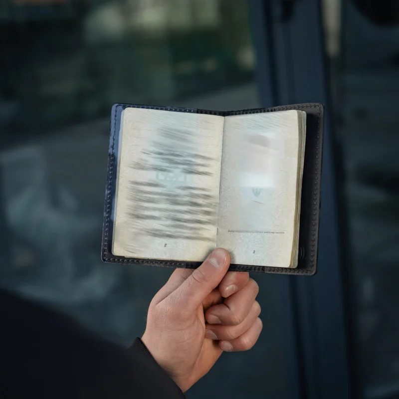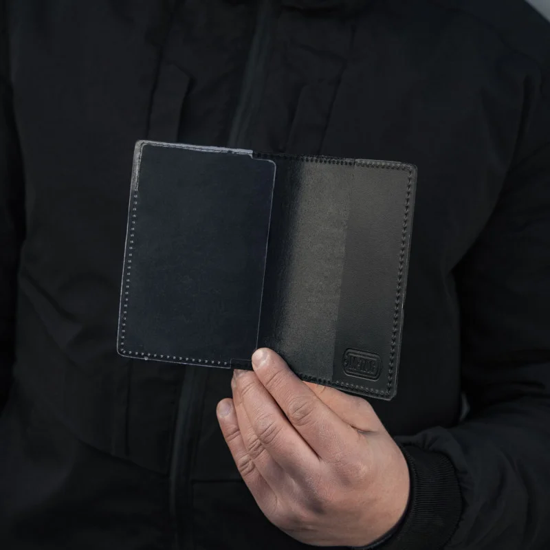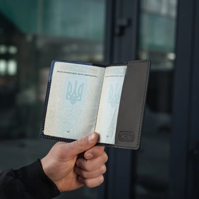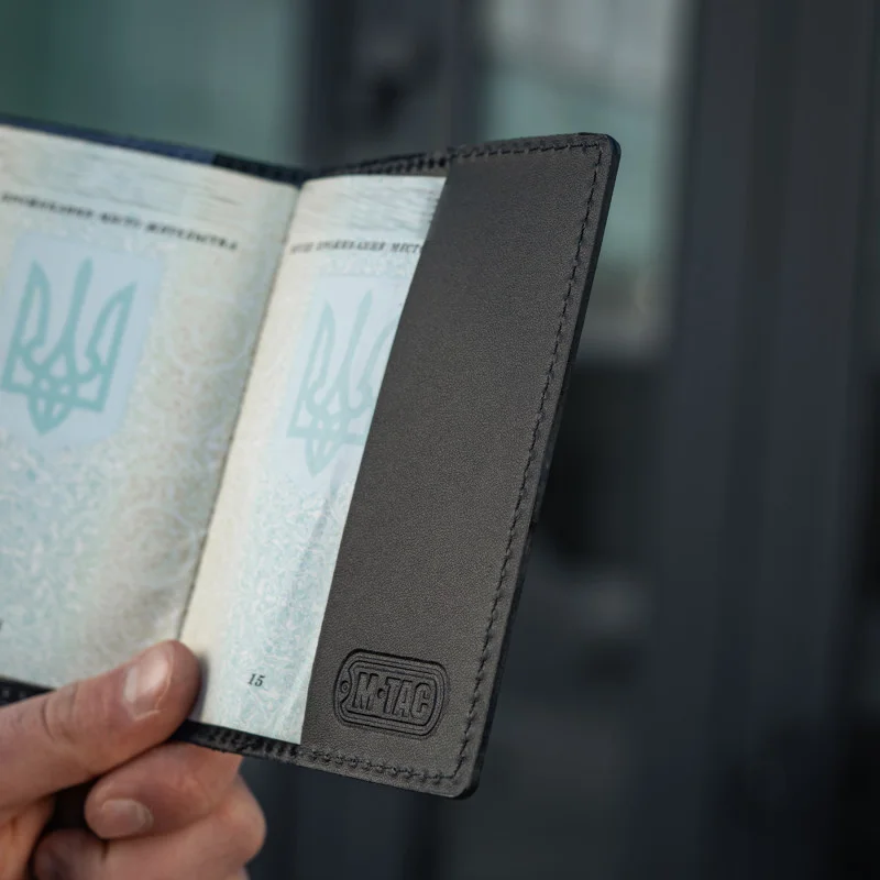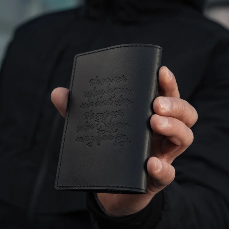Обкладинка виготовлена з натуральної шкіри. Цей матеріал, часто використовується для виготовлення гаманців, обкладинок та картхолдерів, адже володіє винятковою стійкістю до стирання, міцністю та довговічністю. Метод нанесення малюнків та написів - тиснення.