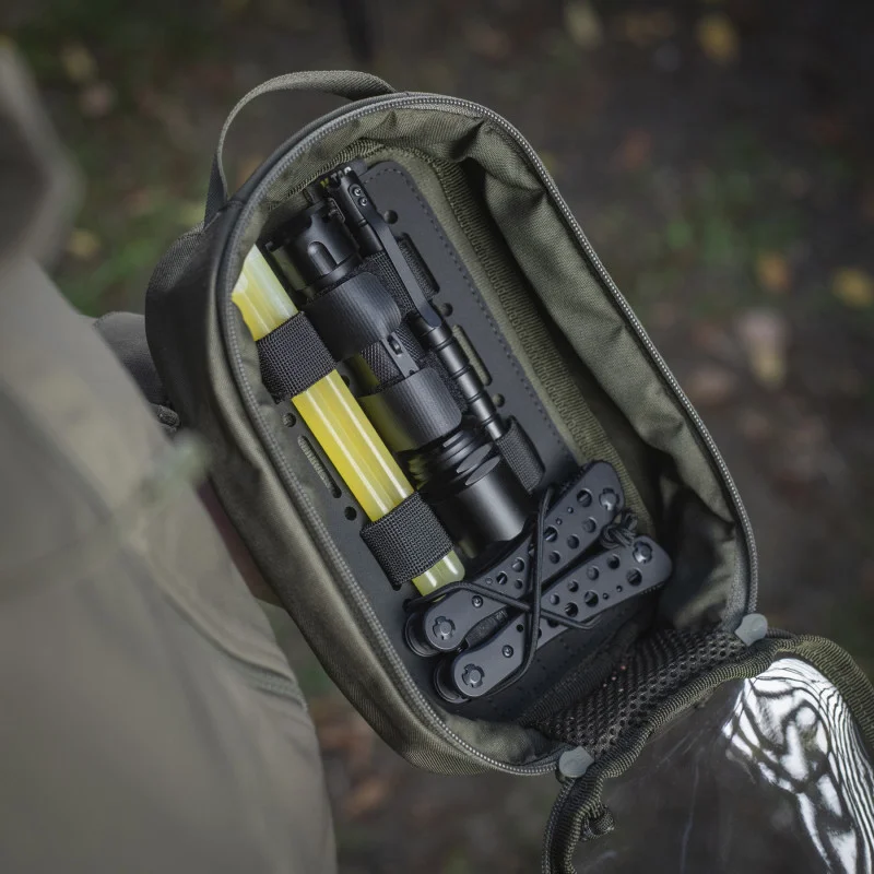 Виготовлений з Cordura 500D – міцного зносостійкого матеріалу, що відмінно тримає форму і не деформується при намоканні. Передня стінка органайзера виконана з прозорої ПВХ плівки, що допомагає швидко ідентифікувати потрібний предмет. Внутрішня стінка органайзера дозволяє прикріпити модульні вставки на велкро. Знизу передбачена спеціальна сітка, яка виконує роль дренажного люверса і забезпечує хорошу циркуляцію повітря. Блискавка додатково оснащена двома світловідбиваючими темляками. Ручка зі стропи MIL-STD призначена для зручного використання органайзера.