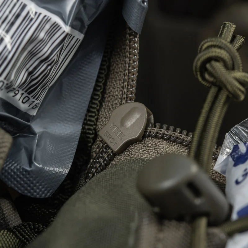 Аптечка має зручну ергономічну конструкцію та легко відкривається одним рухом, що забезпечує швидкий доступ до медикаментів. Внутрішній простір максимально оптимізований та має еластичні кріплення для медикаментів. Частину препаратів можна зафіксувати на внутрішньому відкидному клапані за допомогою резинки. З боків підсумка є MOLLE інтерфейс для кріплення додаткового спорядження чи розміщення ножиць.