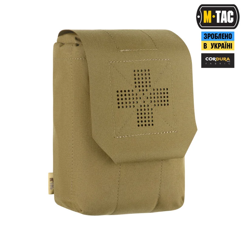 Зовнішній підсумок виготовлений із Cordura 500D – міцного матеріалу, стійкого до стирання та високих навантажень. Внутрішні бічні стінки обладнані нейлоновою стропою, завдяки якій підсумок тримає форму. Додатковим фіксуючим елементом є стяжка, що дає змогу надійно утримувати аптечку навіть при активних рухах. Кріпиться до спорядження за допомогою MOLLE інтерфейсу, виконаного за технологією Laser Cut.