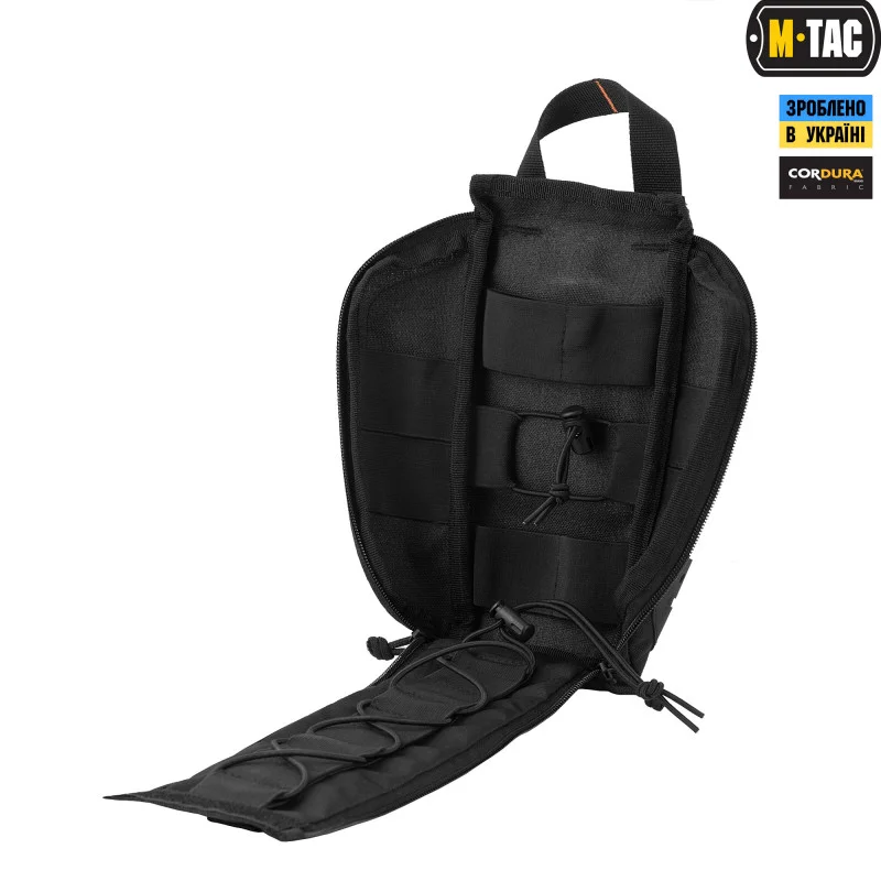 M-Tac підсумок медичний Elite Rip Off повністю відкривається одним рухом за ручку, даючи можливість отримати доступ до всього вмісту, та при цьому нічого не висипається. Частина вмісту аптечки фіксується на резинці (або опціонально на паракорд) на внутрішній частині клапана, що відкривається. Там можна закріпити перевязувальні пакети, бинти, пластирі, рукавички і т.д. З боків підсумка зроблені накладки з прорізами, на які можна навісити додаткові підсумки або спорядження. Зроблені накладки з міцного і водночас еластичного матеріалу. Із першого погляду ви можете прийняти його за резину, але ця схожість тільки зовнішня, так як цей матеріал називається поліетиленовий еластомер. Стійкий до стирання, не боїться ні високих, ні низьких температур. Також на фронтальній частині аптечки є велкро для розміщення необхідних нашивок.