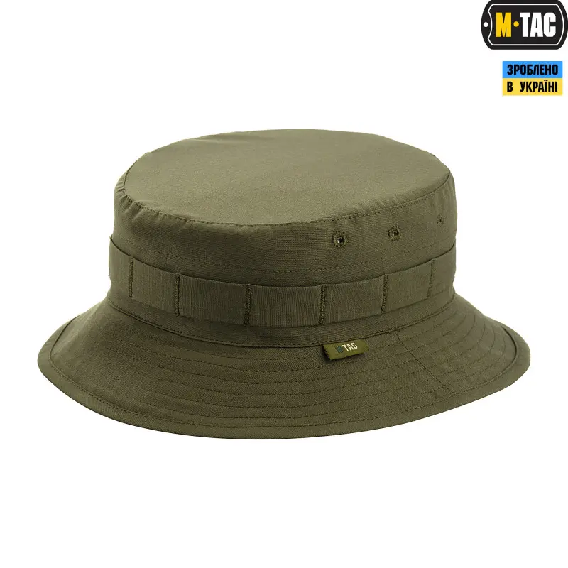 Армійська панама від бренду M-Tac зроблена за зразком легендарної американської моделі Boonie. Має крій з напівжорсткими полями. Тулія з нашитою по периметру стрічкою, яка розрахована на кріплення додаткових засобів маскування. Забезпечена спеціальним шнуром, що не дозволить панамі злетіти з голови під час сильних поривів вітру. Також вона має три вбудованих люверси, які забезпечують відмінну вентиляцію. Панама пошита з міцної та якісної тканини ріп-стоп (63% бавовна, 35% поліестер, 2% спандекс). З вивороту всі шви приховані. Такий спосіб обробки швів робить панаму більш комфортною при тривалому носінні, а також підвищує її стійкість до зношування.
