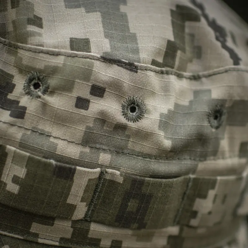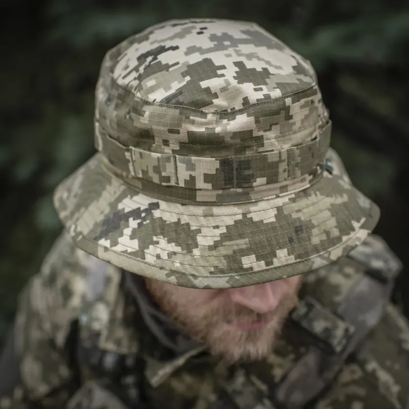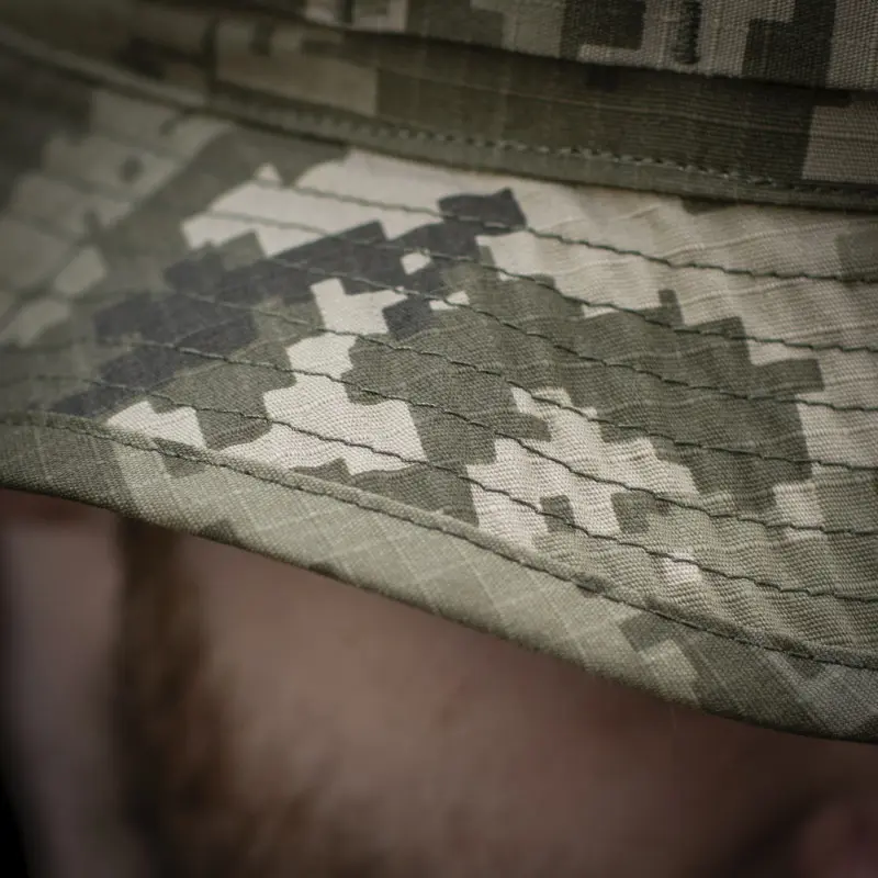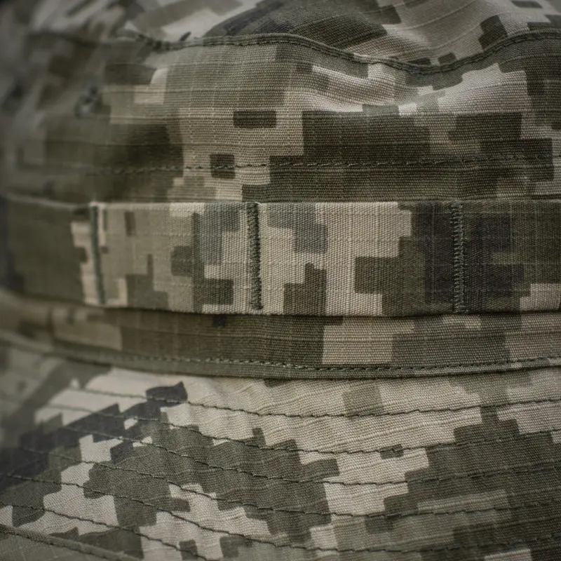 Армійська панама від бренду M-Tac зроблена за зразком легендарної американської моделі Boonie. Має крій з напівжорсткими полями. Тулія з нашитою по периметру стрічкою, яка розрахована на кріплення додаткових засобів маскування. Оснащена спеціальним шнуром, що не дозволить панамі злетіти з голови під час сильних поривів вітру. Також вона має три вбудованих люверси, які забезпечують відмінну вентиляцію. Панама пошита з міцної та зносостійкої тканини ріп-стоп. З вивороту всі шви приховані. Такий спосіб обробки швів робить панаму більш зручною при тривалому носінні, а також підвищує її стійкість до зношування.