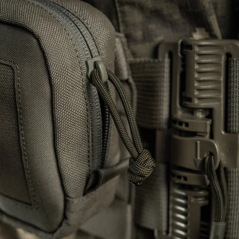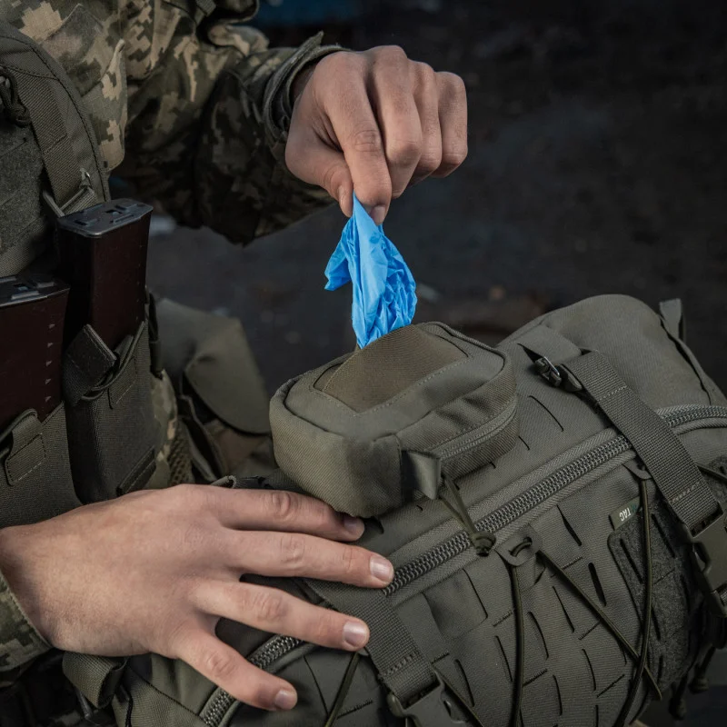Підсумок дозволяє надійно зберігати та переносити медичні рукавиці (оптимальна кількість - 10 пар.) Виготовлений з Cordura 1000D – якісного та зносостійкого матеріалу, що забезпечить захист від механічних пошкоджень та тривалий термін експлуатації. Фронтальна частина виготовлена з Cordura Squadron. На ній розташовані резинки, виготовлені з нейлону, основні функції яких полягають в забезпеченні надійної фіксації вмісту, а також його легкого вилучення. Задня частина також виготовлена з Cordura Squadron і оснащена системою MOLLE Laser Cut. Така система є легшою за стандартну- це, в свою чергу, дозволяє зменшити загальну вагу виробу приблизно на 35%. Підсумок застібається на застібку- блискавку від YKK – світового лідера з виробництва фурнітури. На бігунку присутня спеціальна петля, виготовлена з паракорду. Вона допоможе вам з легкістю відкрити підсумок, та поповнити його вміст.