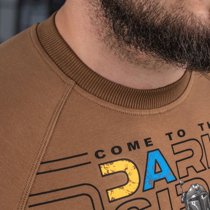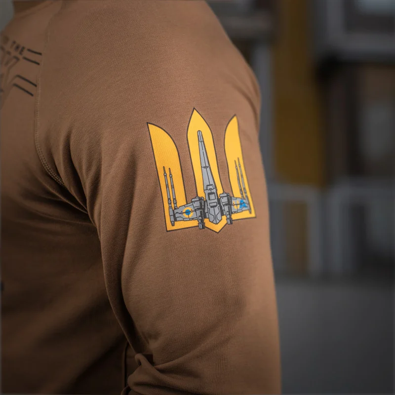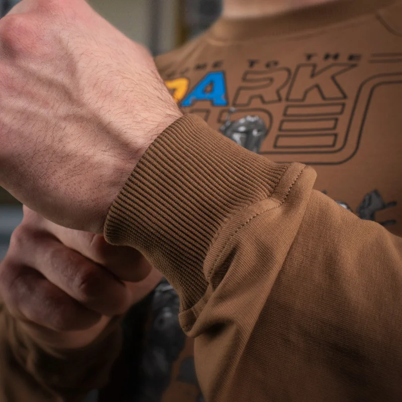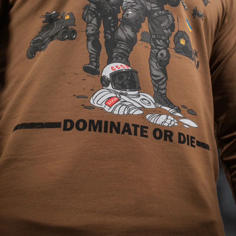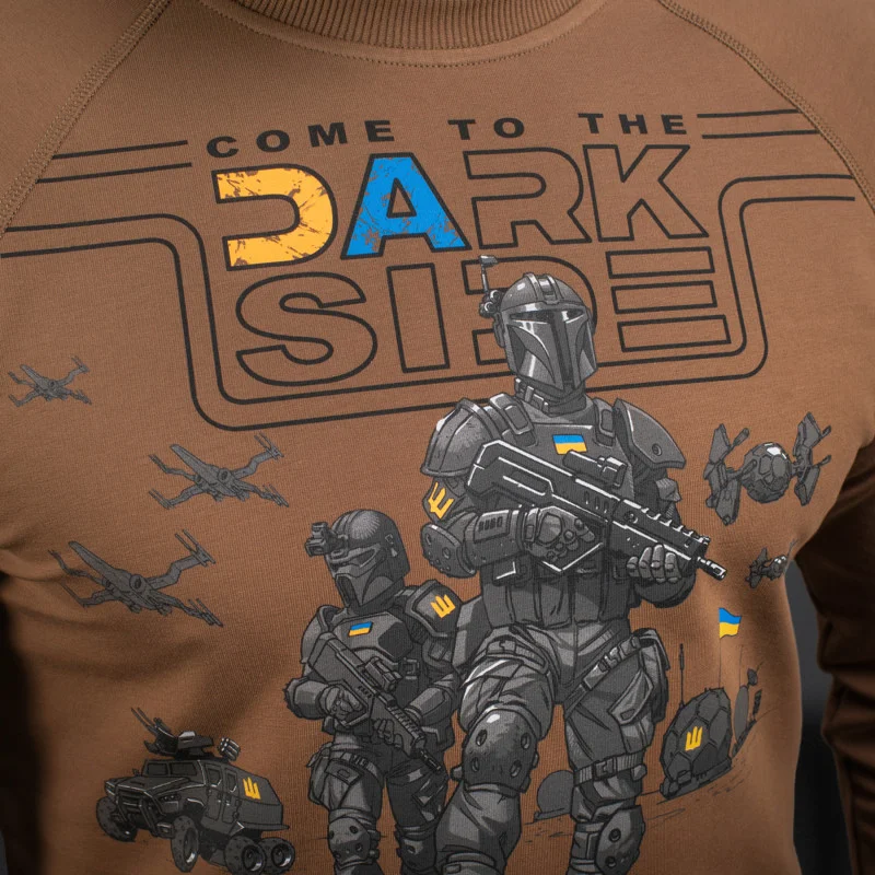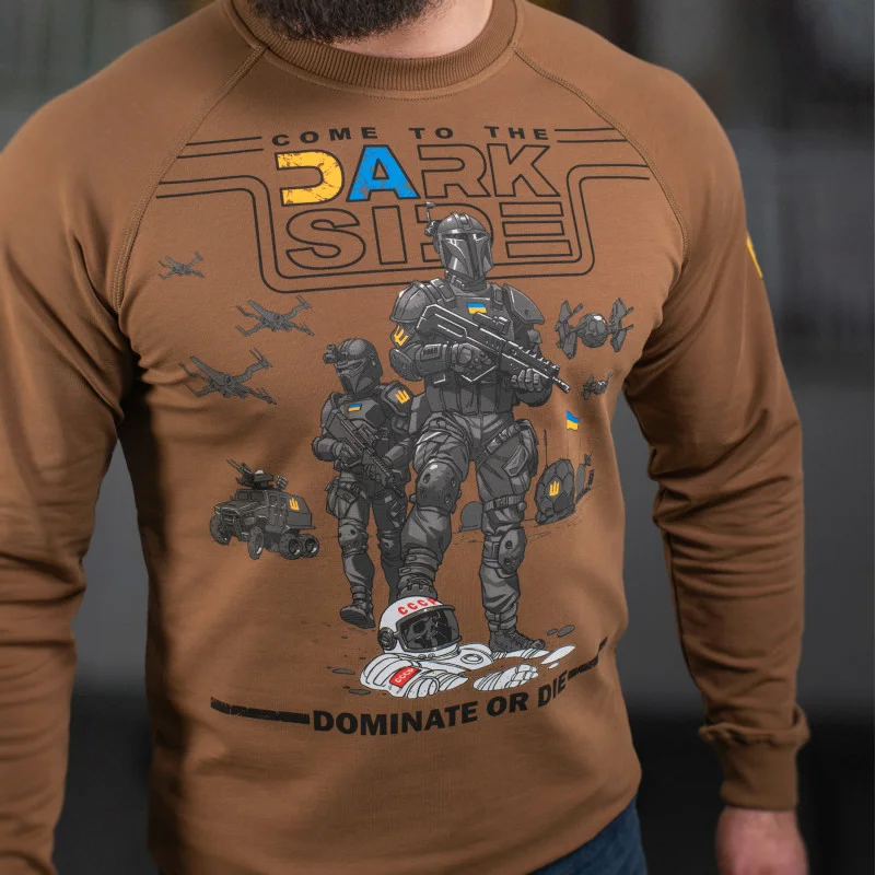 Унікальний принт кофти як ніколи актуальний в умовах сучасних реалій. На принті зображені українські космодесантники зі зброєю в руках, які стоять на трупах радянських ворогів. Написи «Come to the Dark Side» ("Переходь на Темну сторону") і «Dominate or die» ("Домінуй або помри") підкреслюють індивідуальність власника футболки. На рукавах з одного боку розміщений красивий логотип "M-Tac UA", а з іншого – силует українського герба, в якому можна розгледіти винищувач "Темної сторони".