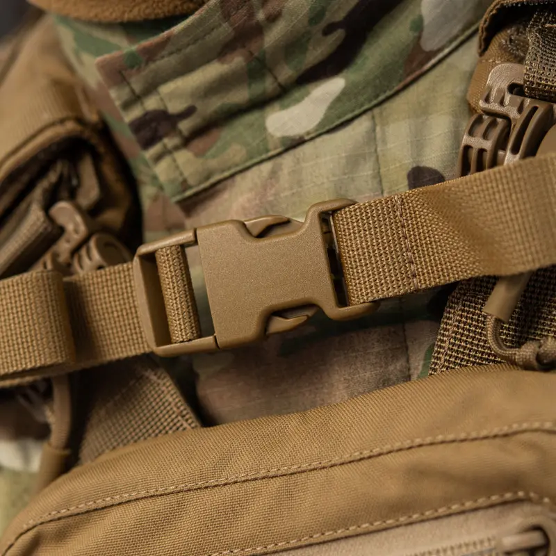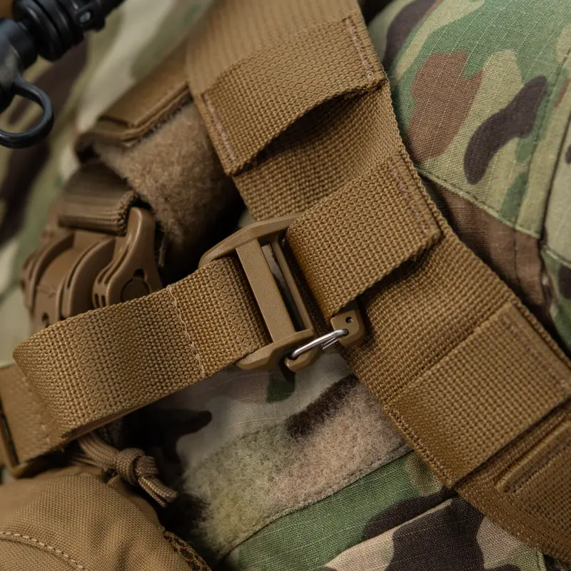 За допомогою регулятора ремня із замком 25 мм (H.D. Gate Keeper Lock Right WJ) стяжки-фіксатори кріпляться своєю задньою частиною до системи Molle Laser Cut на бічній частині рюкзака і застібаються на фронтальній частині рюкзака за допомогою фастексів виробництва Woojin (Корея).