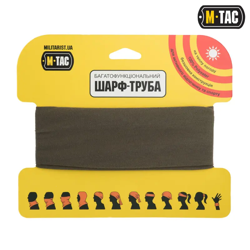 Багатофункціональна бандана, вона ж Multi-Wrap, і вона ж Recon Wrap – це ще один багатофункціональний аксесуар від бренду M-Tac. Виріб виконаний у формі труби з тонкої трикотажної тканини (100% поліестер), яка шляхом нехитрих махінацій може перетворюватися в підшоломник, балаклаву, бандану-сахару, одношарову і двошарову шапку, пилозахисну маску, шарф і потопоглинаючу повязку. Легко тягнеться. Швидко сохне. У складеному вигляді майже не займає місця. Річ однаково корисна як для страйкболу, походів, вело і мотоспорту. Використовується військовими по всьому світу.