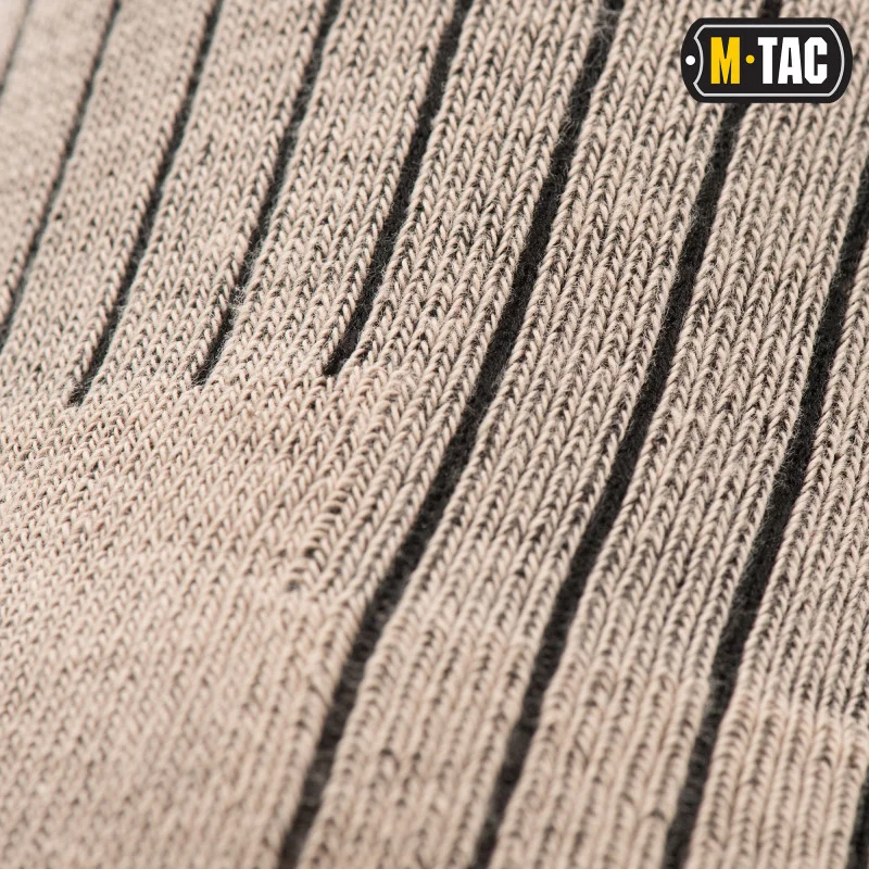 У конструктивні особливості шкарпетки M-Tac входять спеціальні термозони і демпферні ділянки в носковій і пятковій частині з переходом на підйом ноги. Такі демпферні ділянки призначені для захисту ноги від тертя об внутрішні частини черевика при ходьбі.