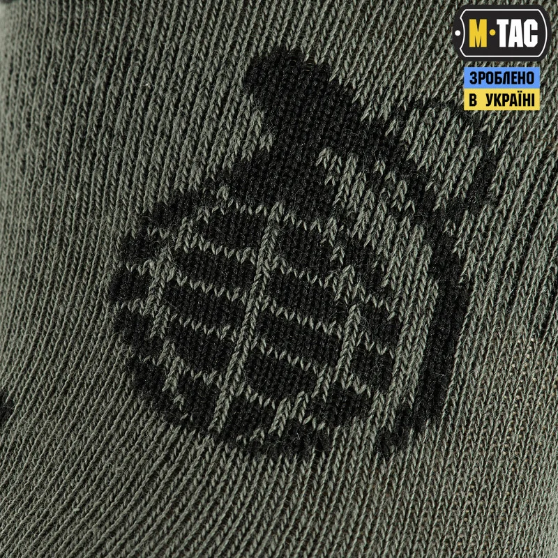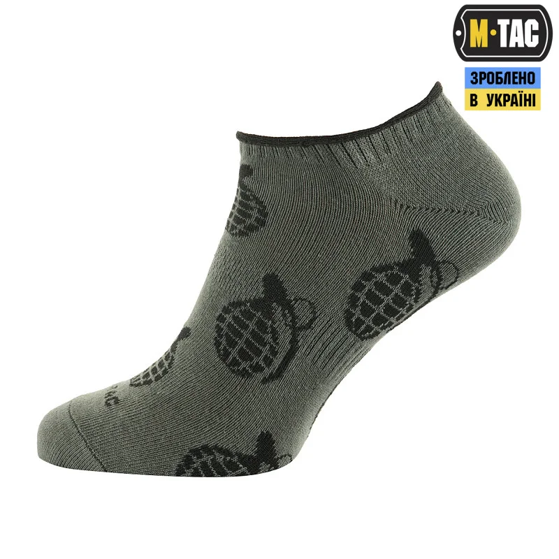 Виготовлені з легкого дихаючого матеріалу: 85% бавовна, 10% поліестер, 5% еластан. Такий склад тканини забезпечує оптимальну терморегуляцію, в результаті якої шкарпетки не парять. Вони мають укорочену конструкцію з ергономічно розташованими точками тиску, що забезпечують оптимальну посадку на нозі, і їх практично не видно у взутті. Зображені гранати придають шкарпеткам оригінального вигляду, а анатомічна форма гарантує комфортне носіння у взутті.