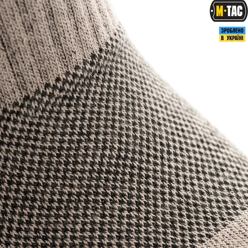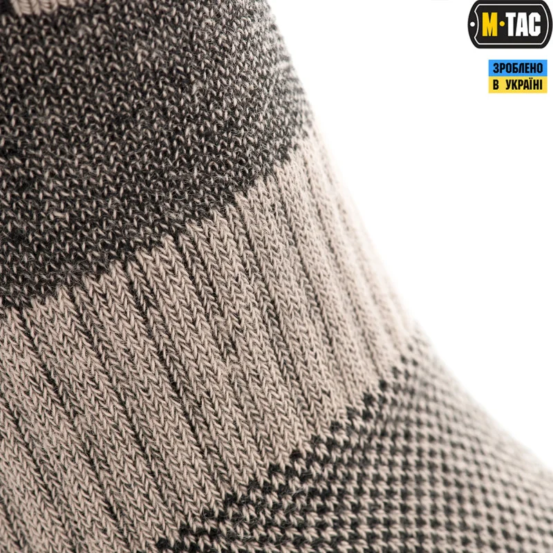 У конструктивні особливості шкарпетки високої M-Tac входять спеціальні термозони і демпферні ділянки в носку і пятковій частині з переходом на підйом ноги, захищаючи гомілковостопний суглоб від вивихів і механічних впливів. Для поліпшення характеристик при інтенсивній ходьбі доданий поперечний фіксатор зводу стопи, який не дає носку в нижній частині збиватися в "гармошку". Широка гумка рівномірно розподіляє навантаження для утримання носка на гомілці. Вся площа ступні амортизується завдяки внутрішньому махровому плетінню, що дозволяє рівномірно розподіляти навантаження маси тіла по всій її поверхні. Трекінгові шкарпетки з текстурними термозонами більшу частину вологи поглинають капілярним шляхом за допомогою вентиляційних каналів, які виводять її назовні через верх взуття. Крім того вони відмінно поєднуються і з мембранним взуттям, так як процес відведення вологи назовні відбувається ще швидше.