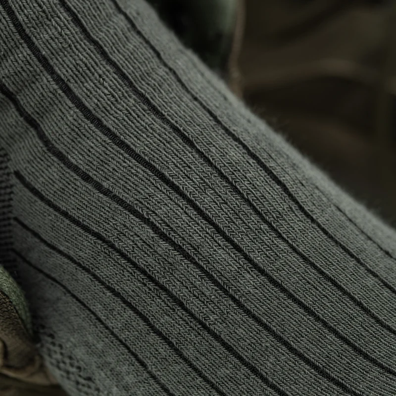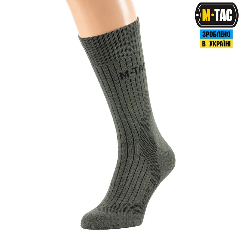 У конструктивні особливості шкарпетки високої M-Tac входять спеціальні термозони і демпферні ділянки в носковій і пятковій частинах з переходом на підйом ноги, захищаючи гомілковостопний суглоб від вивихів і механічних впливів. Для поліпшення характеристик при інтенсивній ходьбі доданий поперечний фіксатор зводу стопи, який не дає носку в нижній частині збиватися в "гармошку". Широка гумка рівномірно розподіляє навантаження для утримання носка на гомілці. Вся площа ступні амортизується завдяки внутрішньому махровому плетінню, що дозволяє рівномірно розподіляти навантаження маси тіла по всій її поверхні. Трекінгові шкарпетки з текстурними термозонами більшу частину вологи поглинають і капілярним шляхом за існуючими вентиляційними каналами виводять назовні через верх взуття. Крім того вони відмінно поєднуються і з мембранним взуттям, так як процес відведення вологи назовні відбувається ще швидше.