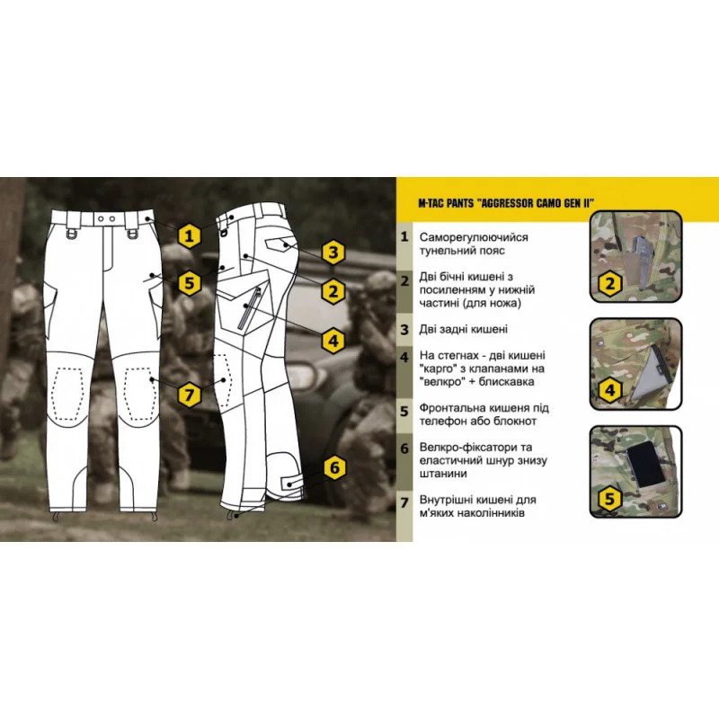 Кишені: - 2 бічні брючні кишені (з посиленням у нижній частині, призначеним для кріплення ножа)