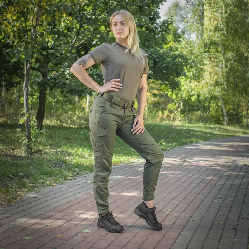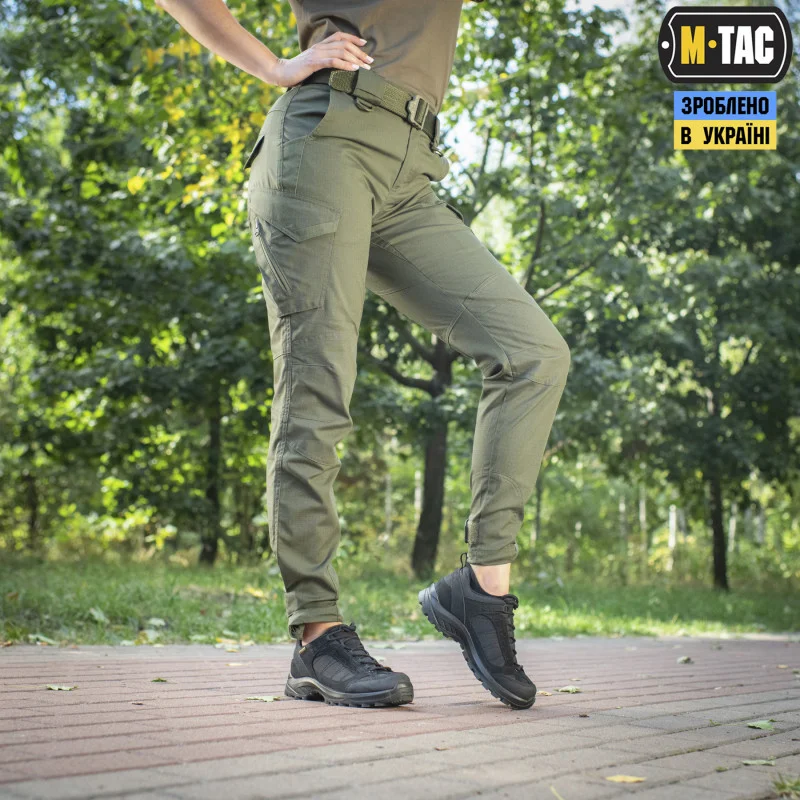 M-Tac штани Aggressor Lady Flex ви можете використовувати як для тренувань, стрільбища, роботи, так і для ділової подорожі або прогулянки. Вітчизняний бренд M-Tac намагається вносити інноваційні технології на ринок. Пошиті штани з легкої, однотонної тканини ріп-стоп, з водо- і брудозахисним просоченням Teflon. Тканина з вмістом поліестеру і бавовни приємна до тіла, добре тримає колір і відрізняється високою міцністю. Основним завданням дизайнерів брюк було зберегти комфорт рухів, і з цим вони впоралися на всі сто відсотків – штани створюють відчуття легкості, не сковують рухів і виглядають стильно. Зручні широкі кишені з посиленими вставками. Брюки розраховані на носіння з ременем шириною до 5.5 сантиметрів. Спереду на кріпленнях для ременя нашиті пряжки для фіксування чого завгодно (за допомогою карабінів). Якісна фурнітура від компанії YKK. Добре підібрані за розміром брюки настільки зручно сидять, що створюється враження, ніби одягнений в спортивні штани.