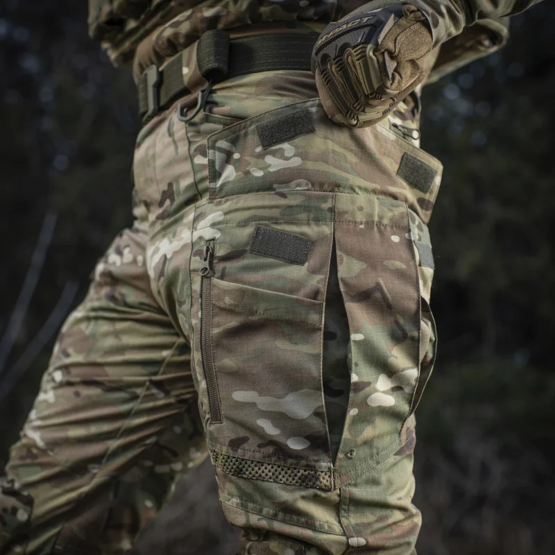Штани оснащені великою кількістю кишень як утилітарних, так і спеціальних: всього їх десять. Задні кишені закриваються на блискавку. Карго кишеня з асиметричним клапаном обладнана додатковою накладною кишенею, в яку поміститься магазин від М4 або АК. Сама карго кишеня досить містка. Вона має дві складки, завдяки яким її розмір можна збільшити для перенесення обємних предметів. Крім цього, карго кишеня оснащена другим входом на блискавці, що дозволяє отримати доступ до її вмісту з положення сидячи. У нижній частині карго кишень є сітка для поліпшення вентиляції.