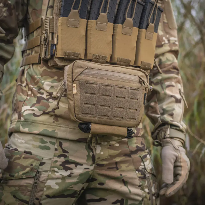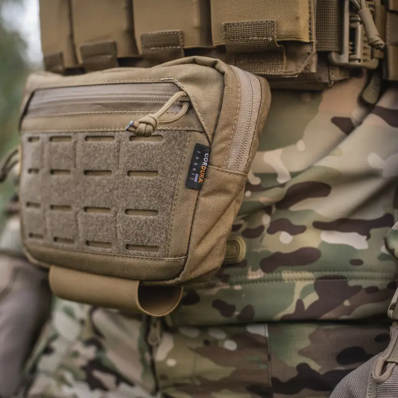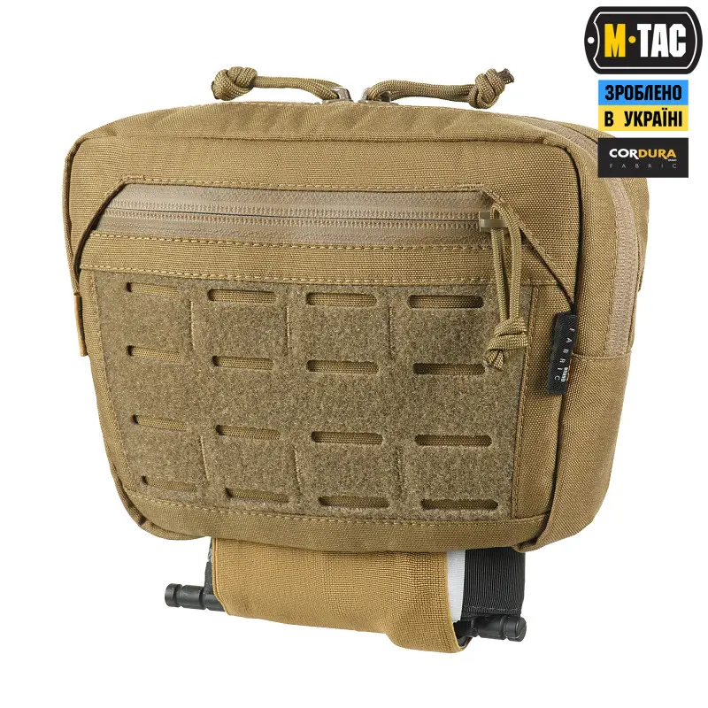 Сумка-напашник має 3 відділення, які дозволяють вмістити речі першої необхідності. Спереду нашита велкро панель, яка виготовлена за технологією LaserCut, і призначена для кріплення спорядження і патчів. Додатково в задню кишеню сумки-напашника можна встановити М-Тас балістичний пакет 1А класу (в комплекті не йде). Знизу виробу дизайнери бренду додали еластичне кріплення для турнікета.