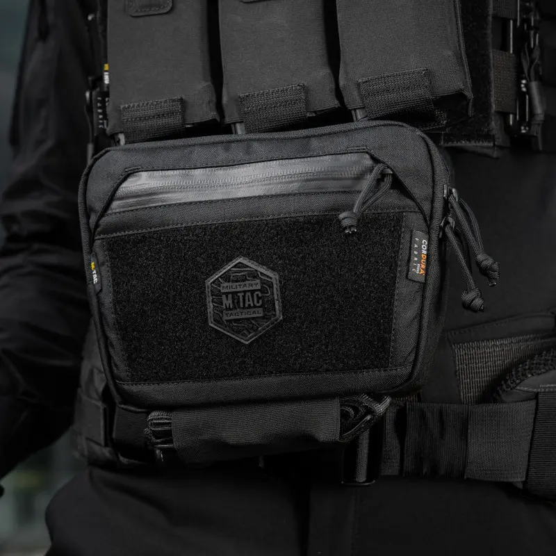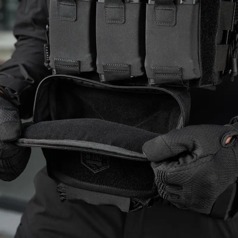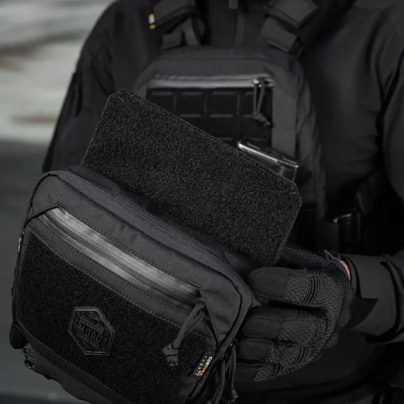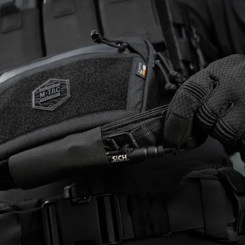Сумка-напашник має 3 відділення, які дозволяють вмістити речі першої необхідності. В даній генерації дизайнери бренду передбачили фронтальну велкро панель, по центру якої розміщений стильний шестикутник із логотипом бренду. Додатково в задню кишеню сумки-напашника можна встановити М-Тас балістичний пакет 1А класу (в комплекті не йде). Знизу виробу є еластичне кріплення для турнікета.