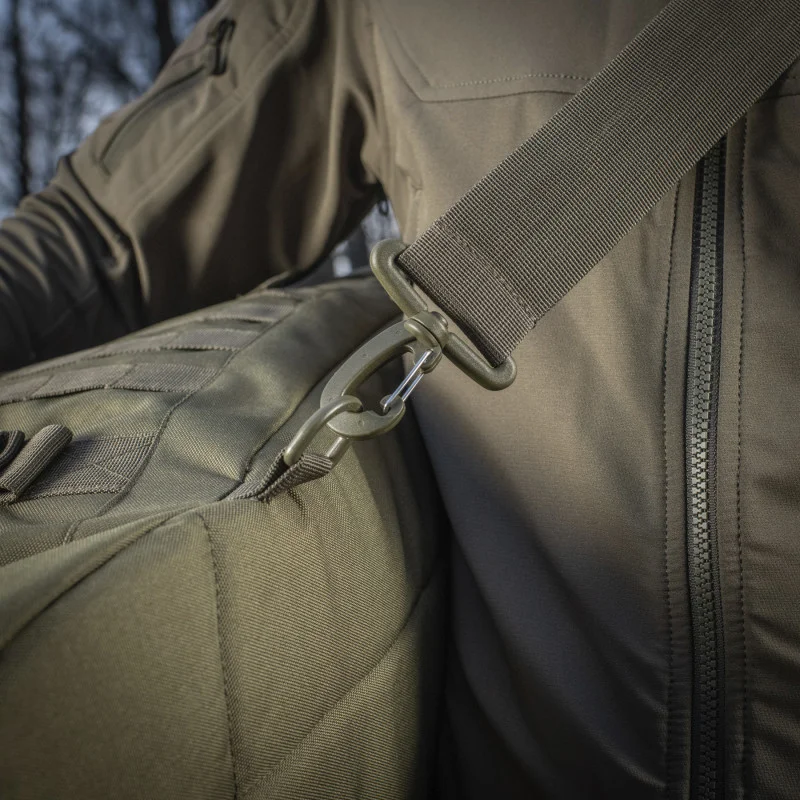 Плечовий ремінь на двох зручних рухливих карабінах з міцного пластику зробить комфортним перенесення сумки на плечі. Ремінь має регулювання за довжиною (може варіюватися від 70 до 144 см.), виготовлений з м'якої, але міцної нейлонової стропи шириною 50 мм.