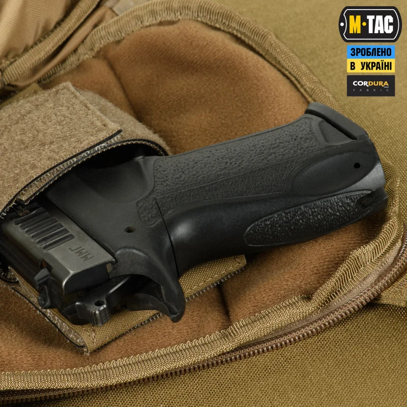 Особливості: | - відділення для прихованого носіння зброї з системою швидкого відкривання та можливістю прикріпити модульні вставки; - два відділення на блискавці призначені для повсякденних речей; - ремінь сумки має фастекс швидкого скидання і регулюється по довжині; - на спинці є відкрита кишеня для смартфона; - спинка оснащена мякою сіткою. |