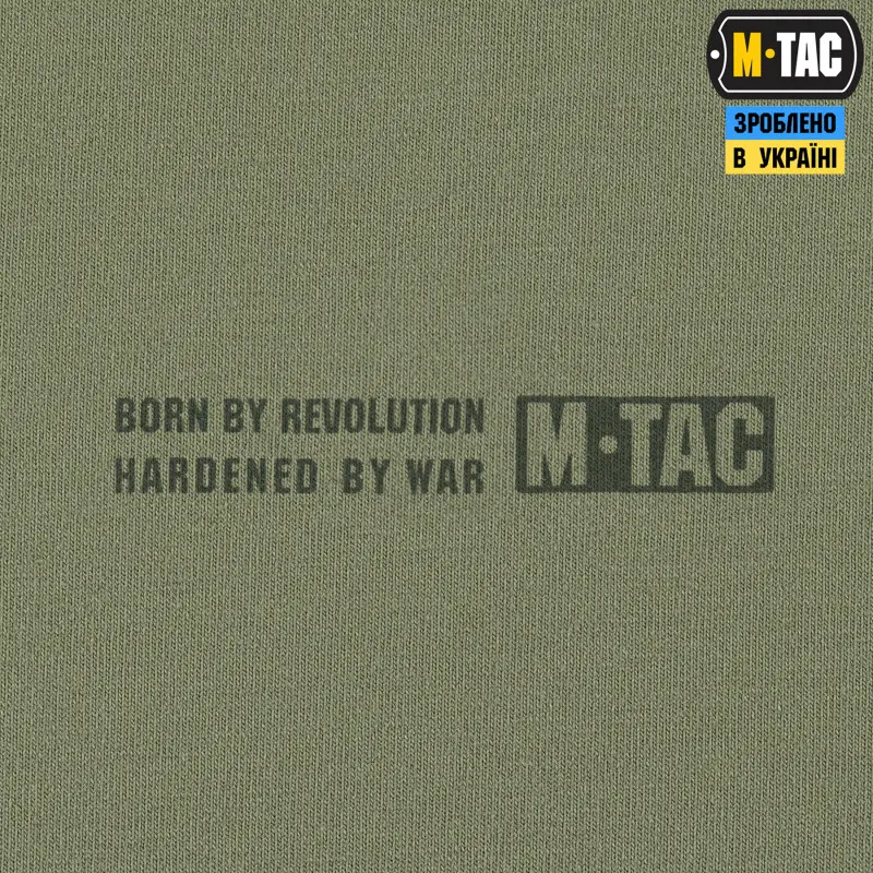 На груди свитшота нанесен логотип М-Тас, а также лозунг бренда: Born by Revolution - Hardened by War, что в переводе означает Рожденный революцией - закаленный войной.