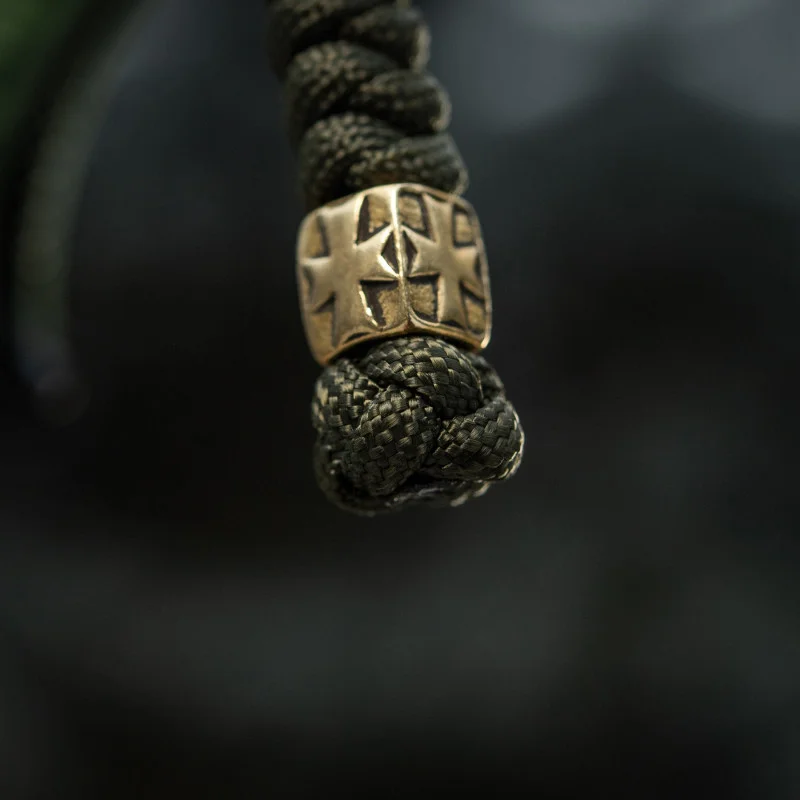 На декоративній намистині зображений козацький хрест. Він є різновидом хреста тамплієрів, а також є одним із основних символів козацтва та українського лицарства.