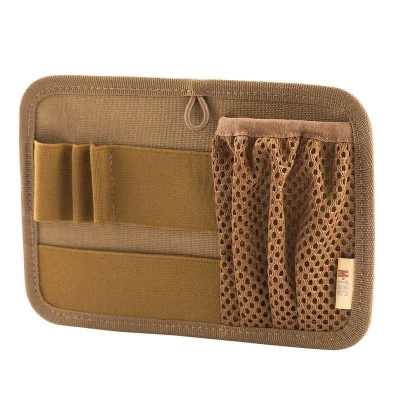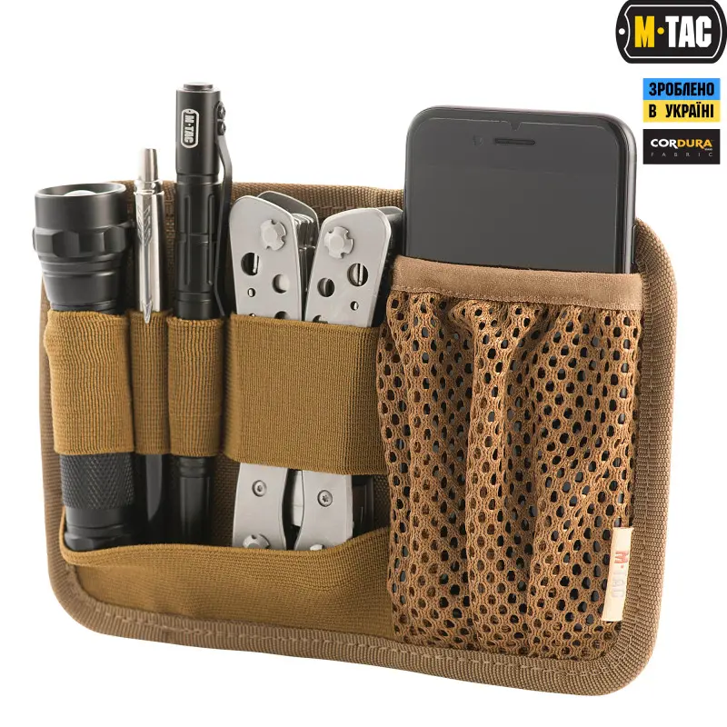 В такому органайзері Ви без проблем розмістите ручки, ліхтарик, ніж. У сітчасту кишеню з горловиною на гумці, що розташована у правій частині панелі, легко поміститься мультитул або мобільний телефон. Петелька у верхній частині панелі дозволить пристебнути ключі або інші цінні предмети.
