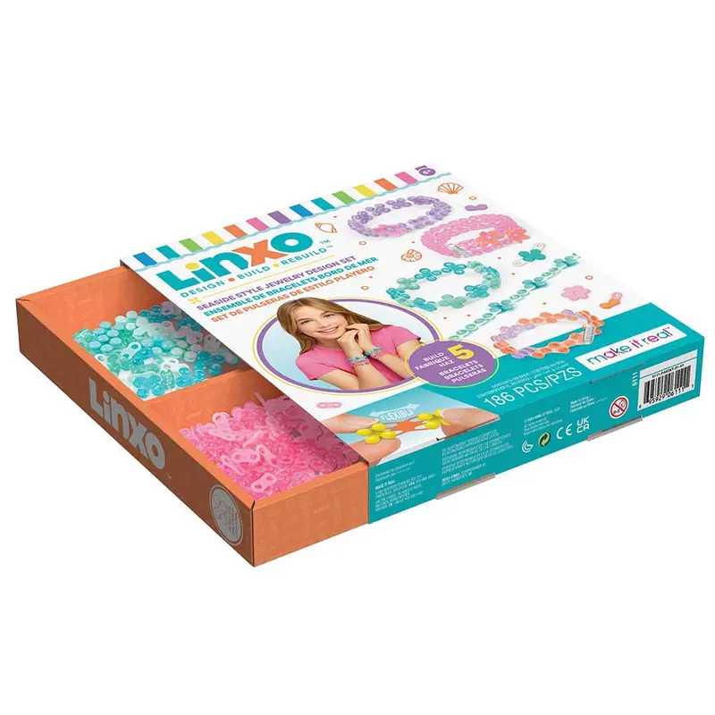 Make it Real.Linxo: Набір для створення браслетів-трансформерів "Прикраси" (в асортименті) - це набір для створення 5 гнучких і стильних браслетів за допомогою конструкційної системи LinXo.LinXo - це система, що дозволяє дітям ствоювати власні унікальні витвори, використовуючи гнучкі та з’єднувані деталі, а потім розбирати їх, щоб продовжувати творчій процес!Набір розвиває творчі здібності та дрібну моторику через практичне конструювання. Ідеально підходить для дітей від 6 років.В наборі: 179 деталей LinXo,2 брелоки,4 прикраси-квіточки,інструкція.