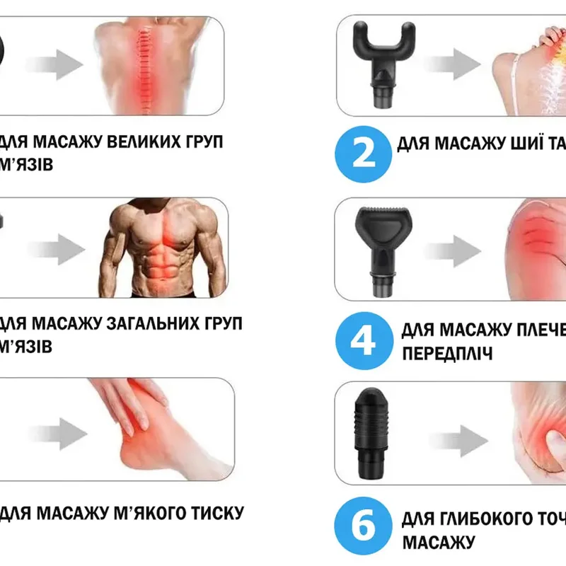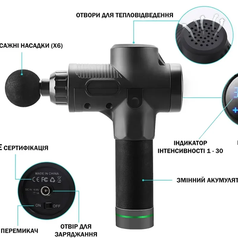 Портативний масажний пістолет EasyFit Percussio - це вдосконалений ударний вібраційний масажер. Вібромасажер є останнім словом у світі масажу, сприяючи поліпшенню стану вашого тіла, надаючи йому здоров'я, підтягнутість або повний розслаблений комфорт. Поєднуючи вібраційні імпульси та перкусію, цей масажний пістолет забезпечує безліч переваг:знімає м'язові болі, розбиваючи вузли та збільшуючи кровотік у м'язах;зменшує час відновлення після фізичних навантажень, позбавляючи тіло від молочної кислоти та токсинів;допомагає розслабитись, охоплюючи масажним ефектом все тіло;Ергономічний дизайн масажера нагадує форму пістолета, що забезпечує комфортне положення в руці та легкість у використанні.30 режимів інтенсивностіВибирайте оптимальну швидкість для вашого комфорту та максимальної користі при масажі різних частин тіла та м'язових груп. Зі швидкістю до 3600 ударів на хвилину ви отримаєте результати, які можна порівняти з професійним масажем.6 насадок для масажу:у комплект входять 6 індивідуальних насадок для ефективного на різні групи м'язів.Кругла насадка для великих м'язових груп, таких як спина, сідниці, стегна та литки.Плоска насадка підходить для всіх м'язових груп.U-подібна насадка для масажу шиї, плечей, спини та ахілла.Насадка у формі кулі - для глибоких тканин, точкового масажу та тригерних точок.Насадка у формі лопатки - для масажу плечей та передпліч.Насадка у формі конуса - для м'якого тиску.Ємний акумуляторБездротовий масажер оснащений якісною літієвою батареєю ємністю 2500 мА, що забезпечує до 6 годин безперервної роботи після повної зарядки.Тихий та потужнийВикористання вдосконаленого безщіткового мотора та подвійного підшипника забезпечує високу потужність та мінімальний рівень шуму - до 45 дБ.Легкий та портативнийЦей ручний електромасажер відмінно підходить як для домашнього використання, так і професійних цілей. Його компактні розміри та переносна сумка-кейс дозволяють легко брати його з собою у тренажерний зал, на роботу чи подорож.Характеристики масажного пістолета EasyFit Percussio:Тип: перкусійний масажер для тілаЗастосування: оздоровчий масажДисплей: сенсорний дисплей LED30 рівнів швидкостіШвидкість: 1200-3600 уд/хвАкумулятор: 2500 мАЧас роботи: до 6 годЧас заряджання: 2 годНапруга заряджання: 220 ВРозмір: 25*24*6,5 смВага: 1,5 кгКомплектація перкусійного вібромасажера EasyFit Percussio:ручний електромасажер6 змінних насадоклітій-іонний акумуляторзарядний пристрійінструкціяпереносна сумкаТовари EasyFit - це ефективність та довговічність, зручність та сучасний дизайн, увага до деталей та побажань користувачів. Всі вироби перед надходженням у продаж тестуються протягом одного до шести місяців в умовах активної, практично цілодобової експлуатації в спортивному залі. Такі випробування дозволяють без огляду рекомендувати спортивний інвентар для екстремальних умов використання!