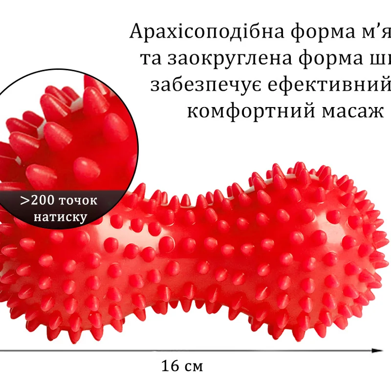 Масажний м'яч подвійний арахіс EasyFit є ефективним засобом для розслаблення м'язів і зняттям стресу, який можна використовувати щодня. Завдяки своїй унікальній структурі з шипованою поверхнею, він стимулює нервові закінчення, сприяє покращенню кровообігу та активізації кровотоку. При виконанні вправ із цим мфр м'ячом відбувається інтенсивна робота з глибокими м'язовими структурами. Масажний м'ячик EasyFit легко вміщується в кишеню, що дозволяє використовувати його скрізь: вдома, на роботі, у транспорті чи залі під час перерви. Він особливо ефективний у реабілітаційних та лікувальних цілях. Крім того, цей масажер виготовлений з ПВХ і не має неприємного запаху.Показання для використання масажного м'ячика Goober EasyFit:Процедури лікувального та профілактичного масажу для всіх областей тіла.Відновлення чутливості нервових закінчень після операцій та травм.Підвищення кровообігу та стимуляція обмінних процесів у сфері застосування.Зменшення напруги та стресу, забезпечення розслаблення.Характеристики подвійного шипованого м'яча для масажу Goober EasyFit:Матеріал: PVCДовжина: 16 смШирина: 6,5 смКолір червонийТовари EasyFit - це ефективність та довговічність, зручність та сучасний дизайн, увага до деталей та побажань користувачів. Всі вироби перед надходженням у продаж тестуються протягом одного до шести місяців в умовах активної, практично цілодобової експлуатації в спортивному залі. Такі випробування дозволяють без огляду рекомендувати спортивний інвентар для екстремальних умов використання!Відтінок кольору зображення товару на фото можуть незначно відрізнятися від фактичного.