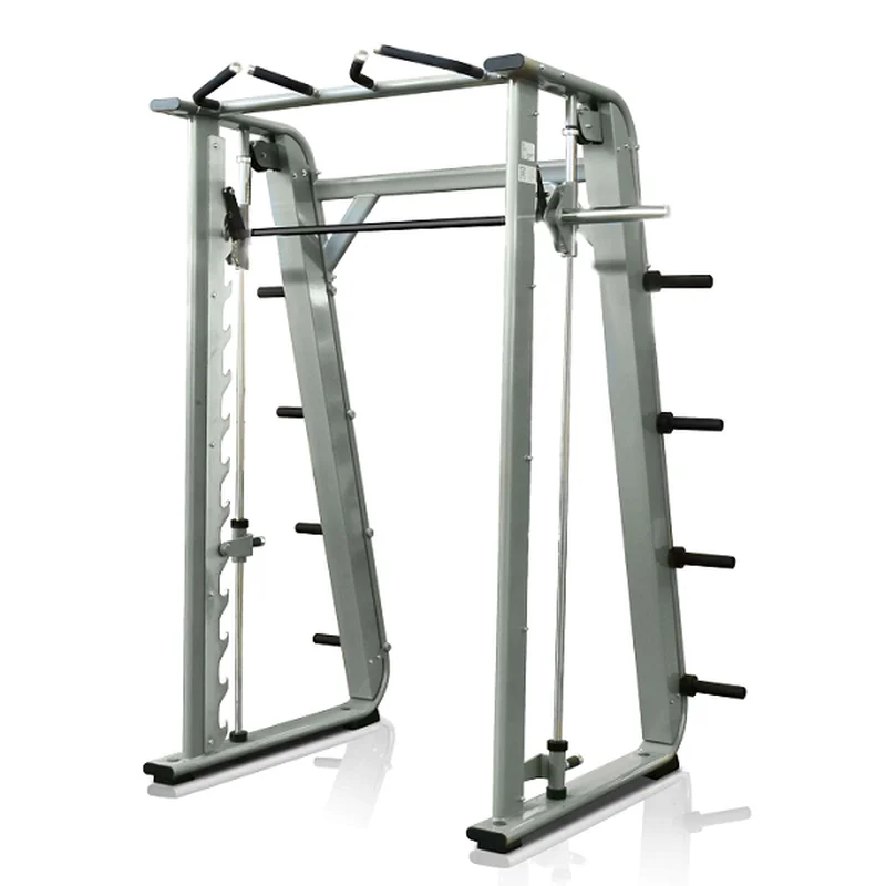 - Оригинальная конструкция каретки и направляющих для ее перемещения обеспечивают легкое, плавное и тихое движение штанги. На верхней перекладине под различными углами установлены рукоятки для висов и подтягиваний.