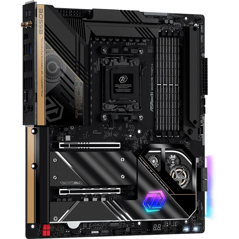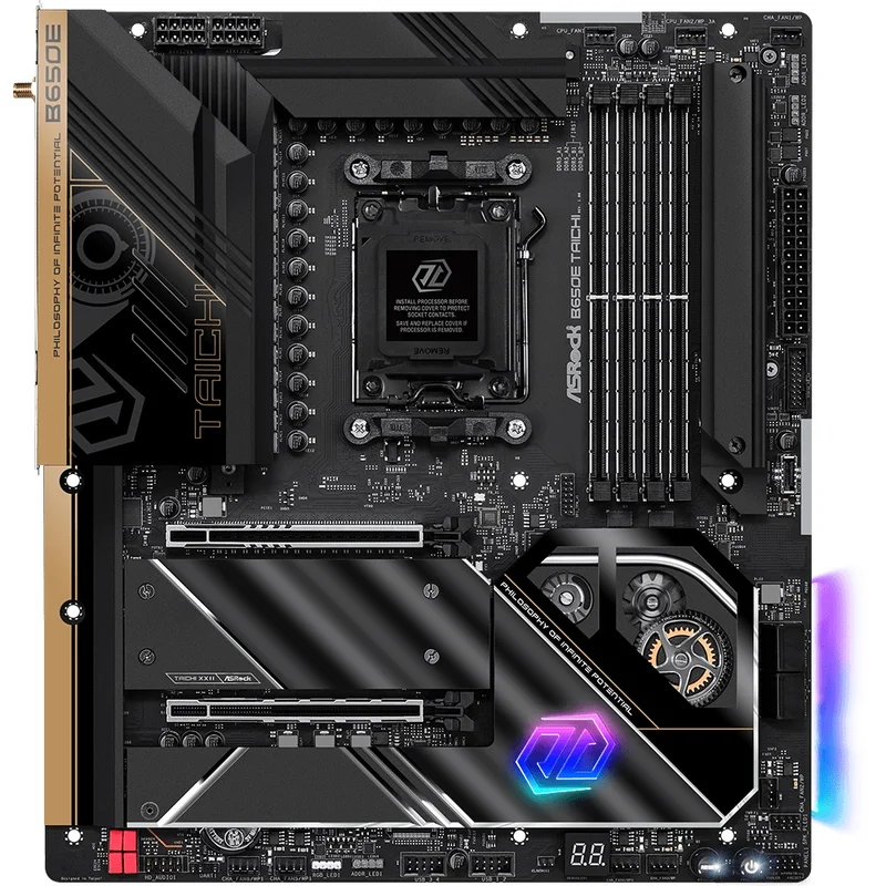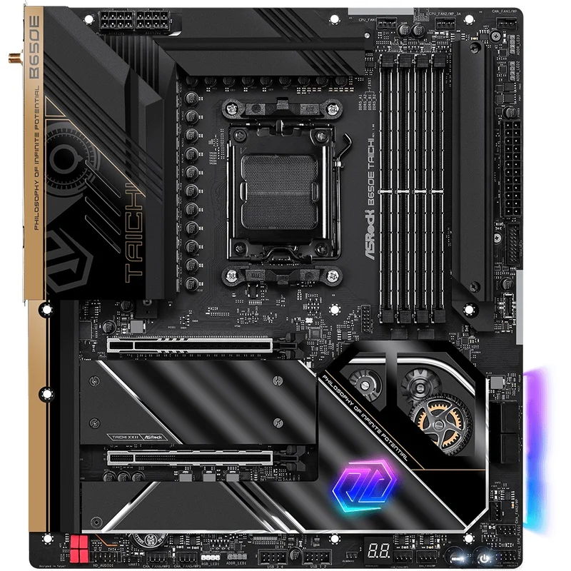 Taichi - це філософське поняття, що відображає неподільність і нескінченний потенціал. Материнська плата, яка впорається з будь-якими завданнями! Вода завжди набуває форми судини, в якій знаходиться. Стань подібний до води. Будь гнучким і універсальним у будь-якій ситуації. Особливості: Чудова продуктивність - PCIe Gen5 (Graphics, M.2) - Підтримка двоканальної пам'яті DDR5 - USB4 Type-C Port (40 Гб/с) Бездоганна надійність - Друкована плата серверного класу з низькими втратами - 24+2+1 Power Phase, 105A SPS for VCore+GT з Укрупнений радіатор - Гнучка вбудована панель роз'ємів - Конденсатори Nichicon 12K Black (100% виготовлені в Японії полімерні конденсатори високої якості та провідності) Ультрашвидкі ігри - Killer 2.5G LAN, Killer 802.11ax Wi-Fi 6EModule - Killer DoubleShot Pro - ASRock Lightning Gaming Ports Оновлення EZ - Перемикач BIOS Flashback - Автоустановник драйверів ASRock