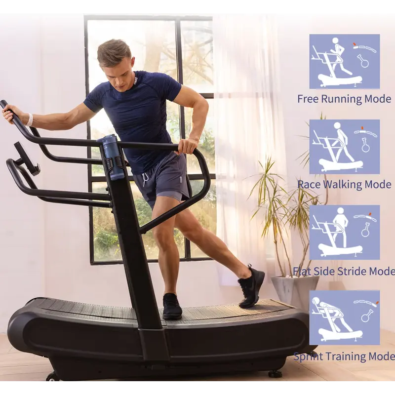 Изогнутая поверхность способствует правильной технике бега, что обеспечивает комфорт и безопасность тренировки. Четыре уровня магнитного сопротивления тренажера позволяют подобрать необходимую нагрузку для эффективной тренировки.